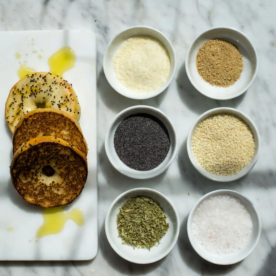 Now, I grab a bowl and mix olive oil with spices. I use garlic powder, onion powder, poppy seeds, sesame seeds, dried oregano, and coarse sea salt. This blend packs a lot of flavor. After mixing, I toss the bagel slices in the oil mixture. I make sure every piece gets coated well. This step is vital for tasty chips.