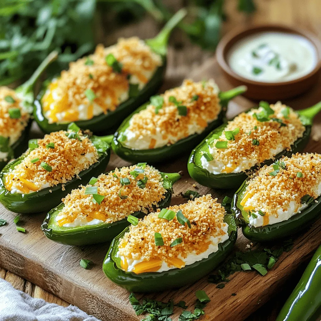 Serve your jalapeño poppers on a rustic wooden board or a colorful platter. Add a sprinkle of fresh herbs like cilantro or parsley for a pop of color. This makes your dish look even more inviting and fun.