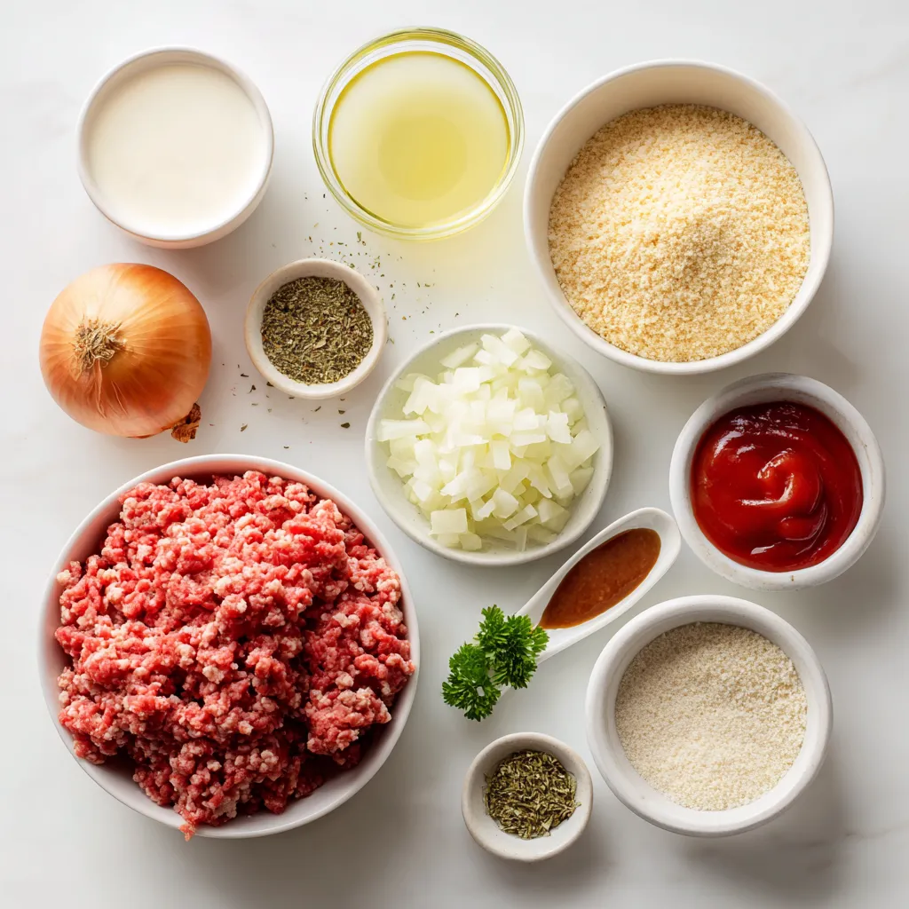 • Add the finely chopped onion, minced garlic, breadcrumbs, milk, egg, Worcestershire sauce, and ketchup.