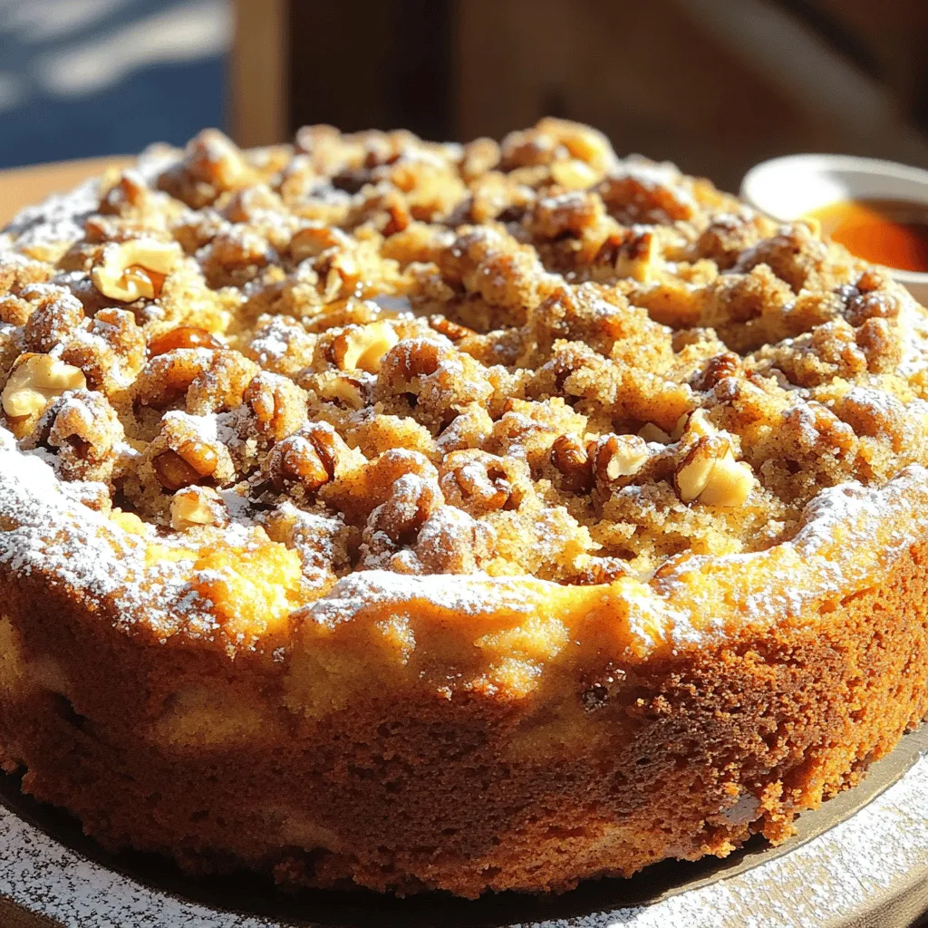 - 2 cups all-purpose flour - 1 cup granulated sugar - ½ cup unsalted butter, softened - 1 cup sour cream - 2 large eggs - 2 teaspoons baking powder - 1 teaspoon baking soda - ½ teaspoon salt - 1 teaspoon vanilla extract - ½ cup maple syrup - 1 cup walnuts, chopped - 1 tablespoon cinnamon - ½ cup brown sugar Each ingredient plays a key role in creating the perfect bakery-style coffee cake. Flour: Use all-purpose flour for a light and fluffy texture. Look for a brand that feels soft and has a fine texture. Sugar: Granulated sugar adds sweetness and helps the cake rise. High-quality sugar will dissolve well and create a smooth batter. Unsalted Butter: Choose a fresh, high-fat butter. It adds richness and flavor. Softening it helps in creaming with sugar easily. Sour Cream: This ingredient adds moisture and tang. A full-fat version works best for creaminess. Eggs: Use large eggs for the best results. They bind the ingredients and help the cake rise. Baking Powder and Baking Soda: These leavening agents create a light cake. Check the expiration date for freshness. Salt: A small amount enhances flavor. Use fine salt for even distribution. Vanilla Extract: Pure vanilla adds depth. Avoid imitation extracts for better flavor. Maple Syrup: Look for pure maple syrup, not imitation. It adds sweetness and a unique flavor. Walnuts: Freshly chopped walnuts give crunch. Choose unsalted nuts for better control of flavor. Cinnamon: Ground cinnamon enhances warmth. Fresh cinnamon has a stronger flavor. Brown Sugar: Light or dark brown sugar adds moisture and a slight caramel flavor. Choose what you prefer. When selecting ingredients, freshness matters. Always check for quality to ensure a successful bake. 1. Preparing the cake pan: Start by preheating your oven to 350°F (175°C). Grease a 9-inch round cake pan with butter. You can also line it with parchment paper for easy removal. 2. Mixing wet ingredients: In a large mixing bowl, cream together ½ cup of softened butter and 1 cup of granulated sugar. Mix until it’s light and fluffy, which takes about 3-4 minutes. Then, add 2 large eggs, one at a time, mixing well after each. Finally, stir in 1 teaspoon of vanilla extract and ½ cup of maple syrup. 3. Combining dry ingredients: In another bowl, mix 2 cups of all-purpose flour, 2 teaspoons of baking powder, 1 teaspoon of baking soda, and ½ teaspoon of salt. Gradually add this dry mix to your wet ingredients, alternating with 1 cup of sour cream. Mix until just combined. Be careful not to overmix. 1. Preparing the streusel or walnut topping: In a small bowl, combine 1 cup of chopped walnuts, ½ cup of brown sugar, and 1 tablespoon of cinnamon. This mix adds a sweet crunch to your cake. 2. Layering technique for the batter and topping: Spread half of the cake batter into the prepared pan. Evenly sprinkle half of the walnut mixture over the batter. Add the remaining cake batter and top it with the rest of the walnut mix, gently pressing it in for a lovely texture. 1. Oven settings and timing: Place the cake in the preheated oven and bake for 40-45 minutes. The cake should be golden brown and rise nicely. 2. How to check for doneness: To check if your cake is done, insert a toothpick into the center. If it comes out clean, your cake is ready. If it has batter on it, give it a few more minutes. This step-by-step guide ensures your Bakery Style Maple Walnut Coffee Cake turns out perfectly. Enjoy the process, and savor the delightful flavors! To make your coffee cake taste great, start by creaming the butter and sugar. This step adds air and makes your cake fluffy. Mix them together until light and fluffy for about 3-4 minutes. This is key! Next, remember not to overmix your batter. Once you add the dry ingredients, mix just until combined. Overmixing can make the cake tough. Keep it gentle, and you’ll have a soft, tender cake. You can boost flavors in your cake by adding spices. Consider a pinch of nutmeg or some ginger. These spices blend well with the maple and walnuts. Always choose fresh ingredients when you can. Fresh eggs and high-quality maple syrup make a big difference. Packaged items are convenient, but fresh ones give better flavor. Trust me, it’s worth it! Make your coffee cake look special by dusting it with powdered sugar. This adds a nice touch and makes it look fancy. Serve your cake with a drizzle of maple syrup on the side. It makes every bite sweeter and adds a lovely shine. You can even add a few whole walnuts on top for a rustic look. Enjoy! {{image_2}} You can easily adjust this recipe to fit different diets. - Gluten-free options: Use gluten-free all-purpose flour instead of regular flour. This swap keeps the cake soft and tasty. Ensure your baking powder is gluten-free too. - Vegan adaptations: Replace eggs with flax eggs. Mix 1 tablespoon of flaxseed meal with 2.5 tablespoons of water. Let it sit for a few minutes until it thickens. Use plant-based butter and non-dairy sour cream for a vegan treat. Get creative with flavors to make this coffee cake your own. - Alternative nuts or fruit: Swap walnuts for pecans or almonds. You can also add dried fruits like cranberries or raisins for a fruity twist. - Incorporating chocolate or other flavorings: Fold in chocolate chips for a sweet surprise. You might also try adding orange zest for a zesty flavor boost. Pair this coffee cake with your favorite drinks or toppings. - Pairing with coffee or tea: This cake goes perfectly with a hot cup of coffee or herbal tea. The rich maple flavor shines with each sip. - Serving with ice cream or whipped cream: For a special treat, serve slices with ice cream or a dollop of whipped cream. Drizzle some maple syrup on top for added sweetness. To keep your maple walnut coffee cake fresh, store it properly. First, let the cake cool completely. Once cooled, wrap it with plastic wrap or aluminum foil. This keeps moisture in and prevents the cake from drying out. Place it in the fridge if you want to ke