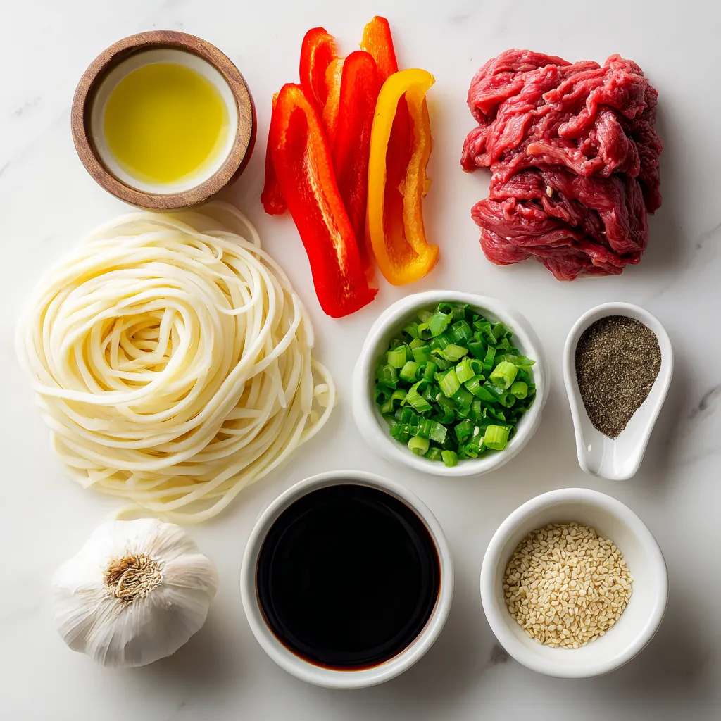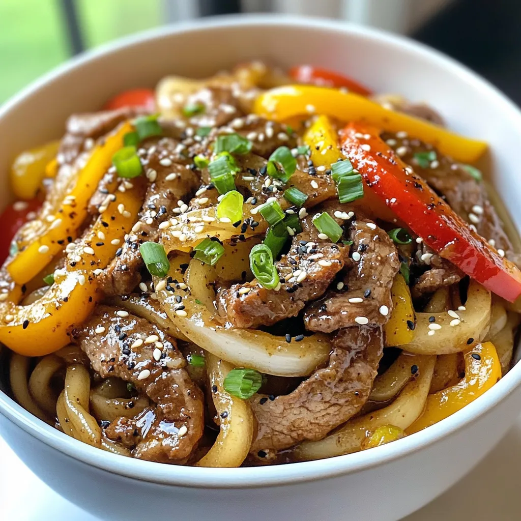 A savory dish featuring udon noodles stir-fried with marinated beef and colorful vegetables, seasoned with black pepper and sesame oil.