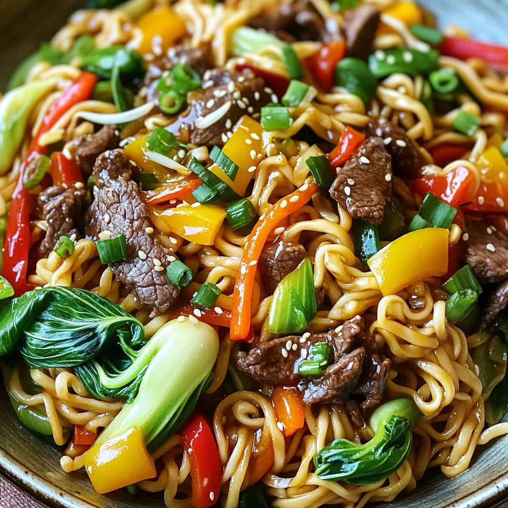 Add minced garlic and ginger to the hot oil. Stir quickly to wake up the flavors. Then, add bell peppers, bok choy, and carrots. Cook these veggies for 3-4 minutes. They should be tender but still crisp. Now, return the beef and noodles to the skillet. Toss everything together gently. Make sure the noodles mix well with the beef and veggies. Season with salt, pepper, and more soy sauce if you like. Cook for another 2 minutes to heat through. Finally, add sliced green onions. Give it a quick toss and remove from heat.