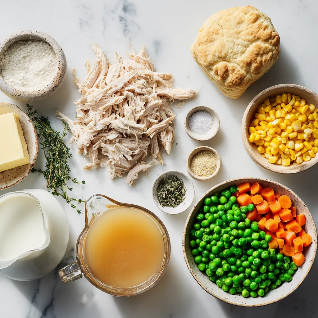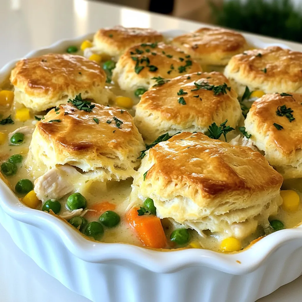 To make this warm and tasty dish, gather these ingredients: - 2 cups cooked chicken, shredded - 1 cup frozen mixed vegetables (peas, carrots, corn, beans) - 1 cup chicken broth - 1 cup milk - 1/3 cup butter - 1/3 cup all-purpose flour - 1 teaspoon garlic powder - 1 teaspoon onion powder - 1/2 teaspoon dried thyme - Salt and pepper to taste - 1 can (about 10 ounces) refrigerated biscuit dough - Fresh herbs (parsley or thyme) for garnish Choosing fresh ingredients is key for great taste. Here are some tips: - Chicken: Use cooked chicken from a rotisserie for great flavor. You can boil or bake chicken breasts if you prefer. - Vegetables: Pick frozen mixed vegetables without added sauces. They’re quick and keep their nutrients. - Broth and Milk: Use low-sodium chicken broth for more control over salt. Whole milk gives a creamy texture. - Herbs: Fresh herbs add brightness. Look for vibrant colors and no brown spots. If you want to mix things up, here are some alternatives: - Chicken: Swap in turkey or even cooked sausage for a different flavor. - Vegetables: Use fresh veggies like bell peppers or mushrooms instead of frozen ones. - Broth: Vegetable broth works well if you want a lighter taste. - Dough: Make homemade biscuits if you want a personal touch. They will add a special flavor. {{ingredient_image_1}} This dish requires a few simple steps. First, you need to gather all your ingredients. Make sure your chicken is cooked and shredded. This recipe takes about 15 minutes to prep, so you can start with the filling while the oven preheats. 1. Preheat the oven to 375°F (190°C). This ensures your pie cooks evenly. 2. Melt the butter in a large saucepan over medium heat. Once melted, add the flour, garlic powder, onion powder, salt, and pepper. Stir to make a roux. Cook this mix for 1-2 minutes until it turns golden. 3. Whisk in the chicken broth and milk slowly. Keep stirring until the mixture thickens. It should bubble gently. 4. Add the shredded chicken and frozen vegetables to the thickened sauce. Stir well and let it simmer for about 5 minutes. Taste and adjust the seasoning with salt, pepper, and thyme. 5. Transfer the chicken mixture into a 9-inch pie dish. Spread it out evenly. 6. Open the biscuit dough can and separate the biscuits. Place them on top of the chicken mix. Make sure to cover the surface evenly. 7. Bake in the oven for 20-25 minutes. The biscuits should turn golden brown and be cooked through. 8. Remove from the oven and let it cool slightly before serving. You can garnish with fresh herbs like parsley or thyme for extra flavor. Enjoy this comforting dish with family or friends! When making Biscuit Chicken Pot Pie, avoid these common pitfalls: - Skipping the Roux: A good roux is key. It thickens the sauce. Skipping it leads to a runny filling. - Overcooking the Vegetables: Frozen mixed veggies cook fast. Add them at the right time to keep their crunch. - Not Seasoning Enough: Taste as you go. If you don’t season well, the dish can taste bland. - Ignoring the Biscuit Dough: Don't stack biscuits too close. They need room to puff up and brown. Making a roux is simple. Here’s how to do it right: 1. Melt Butter: Start with melted butter in a pan. 2. Add Flour: Whisk in flour quickly to avoid lumps. 3. Cook: Stir for 1-2 minutes until golden. This builds flavor. 4. Whisk in Liquid: Slowly add chicken broth and milk. Keep stirring to avoid clumps. The roux should be smooth and thick. This step gives your pot pie a rich flavor. Seasoning makes a big difference. Try these tips: - Use Fresh Herbs: Fresh parsley or thyme adds bright flavor. Add it just before serving for the best taste. - Experiment with Spices: Garlic powder and onion powder are great, but don’t stop there. Try adding a dash of paprika for warmth. - Balance the Salt: Start with a little salt and pepper. Taste and adjust as needed. Too much salt can ruin the dish. - Add Citrus: A squeeze of lemon juice brightens the flavors. Just a little can make a big impact. These tips will help you create a Biscuit Chicken Pot Pie that is full of flavor and comfort. Pro Tips Use Leftover Chicken: This recipe is perfect for utilizing leftover rotisserie chicken or any other cooked chicken you have on hand, making it a great way to save time and reduce waste. Customize Your Vegetables: Feel free to swap in your favorite vegetables or whatever you have in the fridge. Broccoli, bell peppers, or green beans can add great flavor and color. Perfect Biscuit Topping: For extra flavor, brush the biscuit tops with melted butter and sprinkle with garlic powder or herbs before baking. Make It Ahead: You can prepare the chicken and vegetable mixture ahead of time. Just assemble with the biscuits and bake when you're ready to serve. {{image_2}} You can switch up the protein in your pot pie. Try turkey or beef for a twist. You can also use cooked sausage for a hearty flavor. Just ensure the meat is cooked before adding it to the sauce. This small change makes the dish fun and keeps it interesting. For a vegetarian version, replace the chicken with hearty veggies. Use mushrooms, zucchini, or even chickpeas for protein. Keep the mixed vegetables for color and taste. You can add more herbs like rosemary or basil to enhance the flavor. This option is perfect for meatless meals and is still very satisfying. If you need a gluten-free meal, swap the all-purpose flour. Use a gluten-free flour blend instead. Make sure the biscuit dough is gluten-free too. Some stores offer good gluten-free biscuit options. You can also thicken the sauce with cornstarch mixed in cold water. This keeps the rich taste while being safe for those with gluten issues. To keep your Biscuit Chicken Pot Pie fresh, store it in an airtight container. Make sure to let it cool down before sealing. This helps keep the texture nice. Place it in the fridge within two hours of cooking. It will stay good for about three to four days. If you want to save some for later, freezing i
