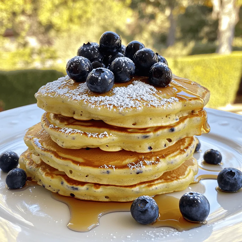 Stack pancakes high on a plate. Add extra blueberries on top for color. Dust with powdered sugar for a nice touch. A drizzle of syrup makes it look tasty and inviting.