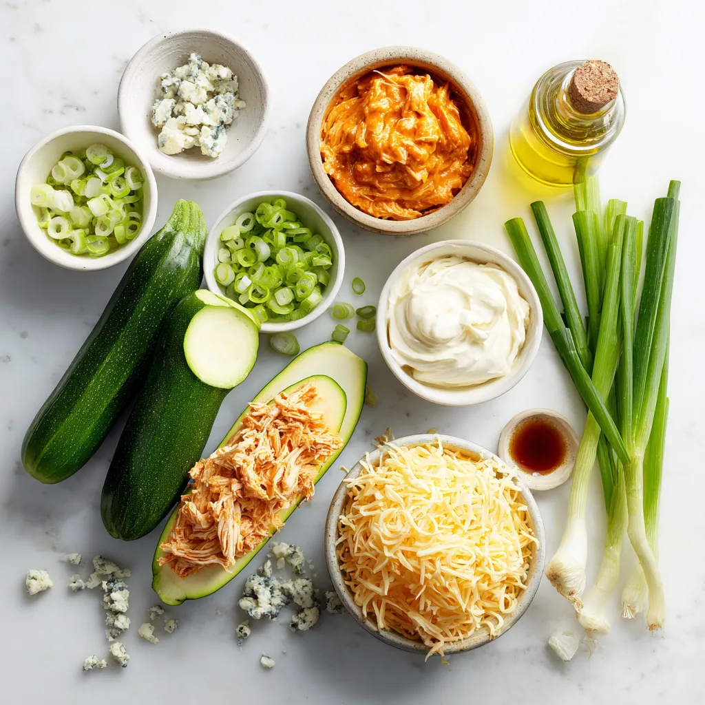Using the right ingredients is key to making tasty Buffalo Chicken Stuffed Zucchini. First, choose 4 medium zucchinis. They are the perfect size for stuffing. You will need 2 cups of shredded chicken. This can be from a rotisserie chicken or any cooked chicken breast you have. The buffalo sauce brings the heat and flavor. Start with ½ cup, but you can add more if you like it spicy.