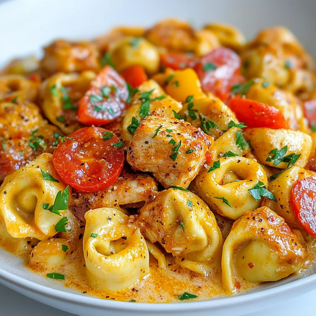 A creamy and spicy dish featuring cheese tortellini and seasoned chicken.