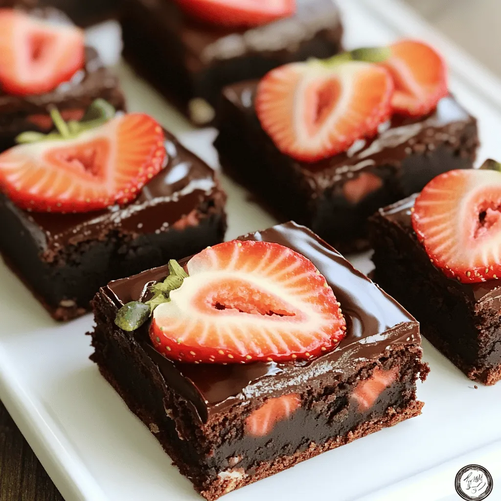 - 1 cup unsalted butter, melted - 2 cups granulated sugar - 1 teaspoon vanilla extract - 4 large eggs - 1 cup all-purpose flour - ½ cup unsweetened cocoa powder - ½ teaspoon baking powder - ¼ teaspoon salt - 1 cup fresh strawberries, hulled and sliced - 1 cup semi-sweet chocolate chips - 1 cup heavy cream When making chocolate covered strawberry brownies, the right ingredients matter. Each part plays a role in creating that perfect treat. - Choosing the best quality chocolate chips: Look for semi-sweet chocolate chips with a rich flavor. Brands with higher cocoa content provide more depth. This enhances the taste of your brownies. - Fresh strawberries vs. frozen strawberries: Fresh strawberries are best for this recipe. They provide a juicy burst of flavor. Frozen strawberries may turn mushy and water your brownies down. - Recommended baking supplies: Use a sturdy mixing bowl and a good whisk. A baking pan lined with parchment helps with easy removal. These tools make your baking process smoother and more enjoyable. Choosing the right ingredients will elevate your dessert. Each item adds to the flavor and texture of your chocolate covered strawberry brownies. Happy baking! - Preheat your oven to 350°F (175°C). Grease a 9x13-inch pan or line it with parchment paper. - In a large bowl, mix melted butter and sugar. Stir until smooth and well combined. - Add eggs and vanilla extract to the mix. Beat until the mixture is creamy and smooth. - Sift the flour, cocoa powder, baking powder, and salt into the bowl. Gently fold until just combined. - Pour the brownie batter into the prepared pan. Spread it evenly across the bottom. - Bake for 25-30 minutes. Check with a toothpick; it should come out with a few moist crumbs. - While brownies bake, prepare the chocolate ganache. Heat heavy cream in a small pot until it simmers. - Remove from heat and stir in chocolate chips. Mix until melted and smooth. Let it cool slightly. - Once brownies cool in the pan, pour ganache on top. Spread it evenly for a nice layer. - Place sliced strawberries on top of the ganache. Press them gently so they stick. - Refrigerate for at least 30 minutes. This helps the ganache set before you cut them. To make the best brownies, avoid common mistakes. Don't overmix the batter. Gently fold in the dry ingredients until just combined. If you mix too long, your brownies can turn out dry. Check for doneness by using a toothpick. Insert it into the center of the brownies. If it comes out with a few moist crumbs, they are ready. Remember, they will continue to cook a bit after you take them out. Cooling is key for the best texture. Let the brownies cool in the pan for about 15 minutes. Then transfer them to a wire rack. This helps them set and keeps them from getting soggy. When serving, presentation matters. Use a white platter to make the brownies pop. Garnish with whole strawberries or a light sprinkle of powdered sugar. This adds a nice touch. Pair the brownies with ice cream or whipped cream. The cold creaminess balances the rich chocolate. Vanilla ice cream works nicely, but feel free to explore other flavors too. Beverage pairings can elevate your dessert. A glass of milk goes great with brownies. For adults, try a rich coffee or a sweet dessert wine. These drinks complement the chocolate flavor well. {{image_2}} You can make these brownies even more fun. Try adding nuts like walnuts or pecans for a crunch. You can also sprinkle on coconut flakes or drizzle caramel for extra flavor. If you want a twist, swap the strawberries for other fruits. Raspberries or bananas work well too. They add a nice touch and keep it fresh. To change the taste, consider infusing flavors. A hint of almond extract or a dash of cinnamon can add warmth. You might also mix in a bit of espresso powder. This will give your brownies a rich depth without being too sweet. You can enjoy these brownies while sticking to your diet. For a gluten-free version, swap all-purpose flour with almond or coconut flour. Make sure to check the packaging to ensure they are gluten-free. If you want a vegan treat, replace eggs with flaxseed meal. Mix one tablespoon of flaxseed with three tablespoons of water. Let it sit until it thickens. Use almond milk instead of heavy cream for the ganache. For those watching sugar, use a sugar substitute in the batter. Many options work well, like stevia or erythritol. They keep the sweetness without the calories. Always check the ratios on the packaging for the best results. To keep your chocolate covered strawberry brownies fresh, store them properly. Use an airtight container to avoid drying out. Place parchment paper between layers if stacking them. This prevents sticking and keeps them nice. - The brownies last up to four days at room temperature. - For longer storage, place them in the fridge for up to a week. - You can also freeze them for up to three months. Wrap each brownie in plastic wrap and then in foil to keep them safe. When you're ready to enjoy a brownie, you may want to reheat it. For the best flavor, use the oven. Preheat to 350°F (175°C). Place the brownies on a baking sheet and warm for about 10 minutes. If you're in a hurry, the microwave works too. Heat on medium power for 15 to 20 seconds. This warms them gently without making them tough. Enjoy your treat warm with the chocolate still gooey! How do I know if my brownies are baked properly? You can check if your brownies are done by inserting a toothpick. If it comes out with a few moist crumbs, they are ready. If it comes out clean, they may be overbaked. Can I make the brownies ahead of time? Yes, you can make the brownies one day ahead. Just store them in an airtight container. This helps the flavors meld and improves the taste. What can I do if I don’t have heavy cream? If you lack heavy cream, use half-and-half or milk with butter. Mix two tablespoons of melted butter with a cup of milk to create a similar texture. What’s the best way to cut bro