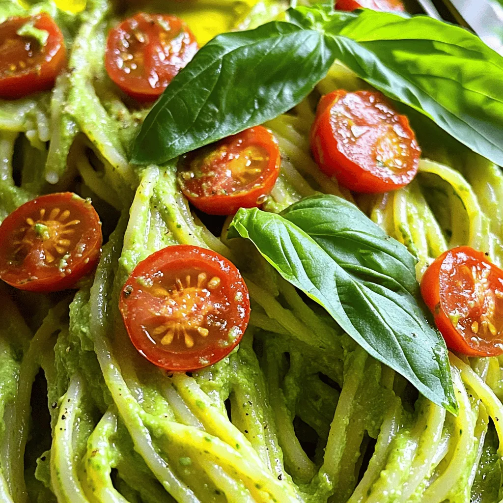 - Ripe avocados (2) - Garlic cloves (2) - Lemon juice (1 tablespoon) - Fresh basil leaves (1/4 cup) - Olive oil (2 tablespoons) - Salt and pepper - Pasta of choice (8 oz spaghetti) - Parmesan cheese (optional, 1/4 cup) - Cherry tomatoes (for garnish) - Extra basil leaves (for garnish) Creamy avocado pasta is simple and tasty. You need just a few fresh ingredients. Start with two ripe avocados. Their rich texture creates the creamy sauce. Next, use two garlic cloves to add flavor. Fresh garlic gives the dish a nice kick. For brightness, add one tablespoon of lemon juice. This helps balance the creaminess. Fresh basil leaves are a must. Use about a quarter cup for a fresh taste. Olive oil adds richness to the sauce. Use two tablespoons for a smooth blend. Always remember to season with salt and pepper to taste. For the pasta, spaghetti works well, but you can choose any type. Eight ounces is enough for four servings. If you love cheese, add grated Parmesan. About a quarter cup will enhance the flavor. Finally, gather cherry tomatoes for garnish. They add color and a fresh bite. Extra basil leaves also make a nice touch on top. With these ingredients ready, you can make a delightful meal that everyone will love. 1. First, fill a large pot with water and bring it to a boil. 2. Add a generous pinch of salt to the boiling water. This adds flavor to the pasta. 3. Next, add 8 ounces of spaghetti to the pot. Cook according to the package instructions until it is al dente. 4. Once the pasta is ready, carefully drain it in a colander. 5. Remember to save about a cup of the pasta water before draining. This water helps make the sauce creamy. 1. While the pasta cooks, take two ripe avocados and cut them in half. Remove the pits. 2. In a food processor, add the avocado flesh, two minced garlic cloves, and one tablespoon of lemon juice. 3. Toss in 1/4 cup of fresh basil leaves and two tablespoons of olive oil. 4. Blend the mixture until it is smooth and creamy. If it feels too thick, you can add a bit of reserved pasta water to your liking. 5. Season the sauce with salt and pepper. 1. Return the drained spaghetti to the pot over low heat. 2. Pour the creamy avocado sauce over the pasta. Toss gently to coat every strand. 3. If you like, sprinkle in 1/4 cup of grated Parmesan cheese and mix it well. 4. Serve your pasta right away. Garnish with halved cherry tomatoes and extra basil leaves for a fresh look. If your avocado sauce is too thick, use pasta water to fix it. After cooking your spaghetti, set aside a cup of the pasta water. When you mix the sauce with the pasta, add a little pasta water at a time. This helps the sauce coat the pasta better. Aim for a smooth and creamy texture that clings to every strand. Want to make your dish even better? Consider adding spices. A pinch of red pepper flakes gives heat. Fresh herbs like cilantro or parsley can add a fresh taste. You can also mix in some lemon zest for brightness. Experiment with these ingredients to find your favorite flavor boost. Different pasta types cook at different speeds. For example, penne or fusilli may need extra time compared to spaghetti. Always check the package instructions. For best results, cook pasta until al dente, so it holds its shape. Adjust your cooking times based on your choice of pasta to ensure it pairs well with the creamy sauce. {{image_2}} You can easily make this dish gluten-free. Simply swap regular pasta for gluten-free pasta. Choices like brown rice pasta or chickpea pasta work great. Cook them just like regular pasta and follow the same steps. Want to make this vegan? Omit the Parmesan cheese and try a plant-based substitute. Nutritional yeast gives a cheesy flavor without dairy. You can also add a splash of almond milk for extra creaminess. This keeps the dish rich and satisfying. To make your creamy avocado pasta even more special, add proteins or veggies. Grilled chicken or shrimp enhances the dish. If you prefer plants, try adding spinach or peas. Cherry tomatoes add a pop of color and taste too. Mix and match to find your favorite combo! Store your creamy avocado pasta in an airtight container. Make sure to cover it well. You can keep it in the fridge for up to three days. The avocado may darken slightly, but it will still taste great. If you see brown spots, just mix it well before serving. To reheat the pasta, use a pan over low heat. Add a splash of water or olive oil to help it stay creamy. Stir gently to warm it through without cooking it again. You can also use a microwave, but cover it to keep moisture in. Heat in short bursts, stirring often for even warmth. You can freeze creamy avocado pasta, but it may change in texture. To freeze, place the pasta in a freezer-safe container. Leave some space at the top for expansion. It stays good for about one month. When you're ready to eat, let it thaw in the fridge overnight. Reheat as mentioned before for the best results. Yes, you can prepare this dish ahead of time. Cook the pasta and make the sauce separately. Store the pasta in an airtight container in the fridge. Keep the avocado sauce in another container. When ready to eat, mix them together. This keeps the pasta fresh and the sauce creamy. To ripen avocados fast, place them in a brown paper bag. Add an apple or banana to speed up the process. The gases from these fruits help avocados ripen quicker. Check them after a day. If they're soft, they're ready to use! Absolutely! You can try parsley, cilantro, or mint. Each herb adds a unique flavor. Parsley gives a fresh taste, while cilantro adds a bit of zest. Mint brings a cool twist. Feel free to mix them for a fun flavor blend! This blog post covers a delicious avocado pasta recipe. We explored key ingredients, from ripe avocados to pasta. I shared simple steps to cook the pasta and make a creamy sauce. Tips showed ways to enhance flavor and ensure perfect texture. We also discussed variations for gluten-free and vegan diets. In closing, I encourage y