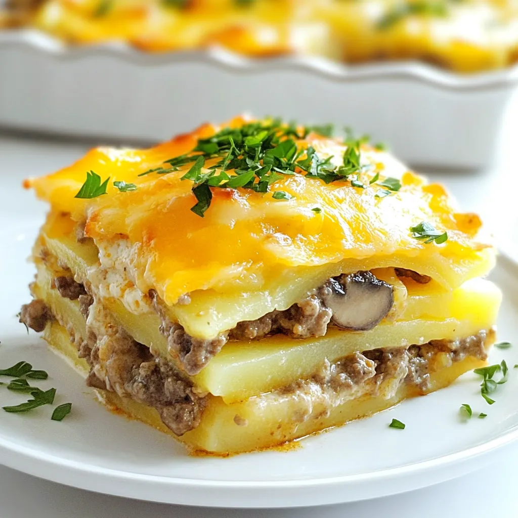 A hearty and comforting casserole featuring layers of ground beef, sliced potatoes, and creamy sauces topped with cheddar cheese.