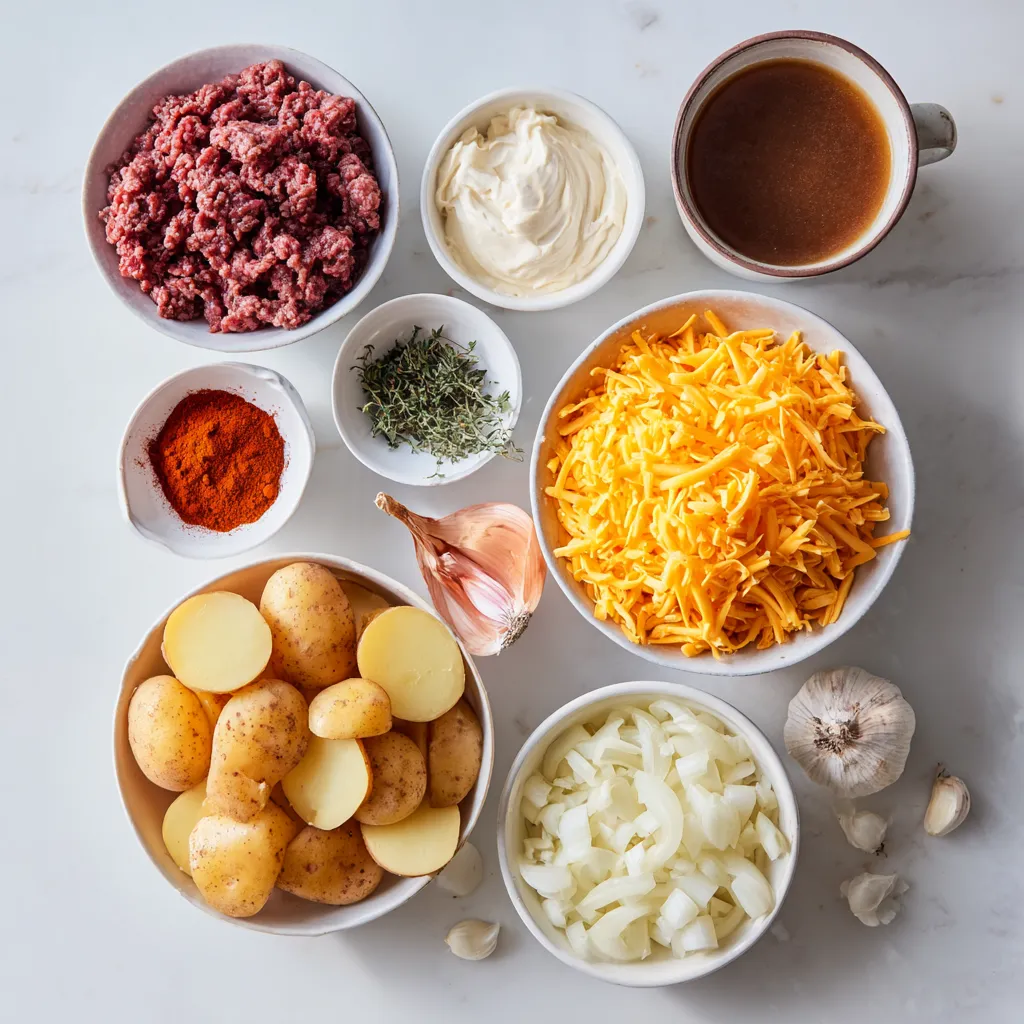 The main ingredients create the heart of this dish. Ground beef gives it a rich flavor. Potatoes add a comforting texture. Onion and garlic bring out the savory notes. Cream of mushroom soup ties everything together with a creamy touch.