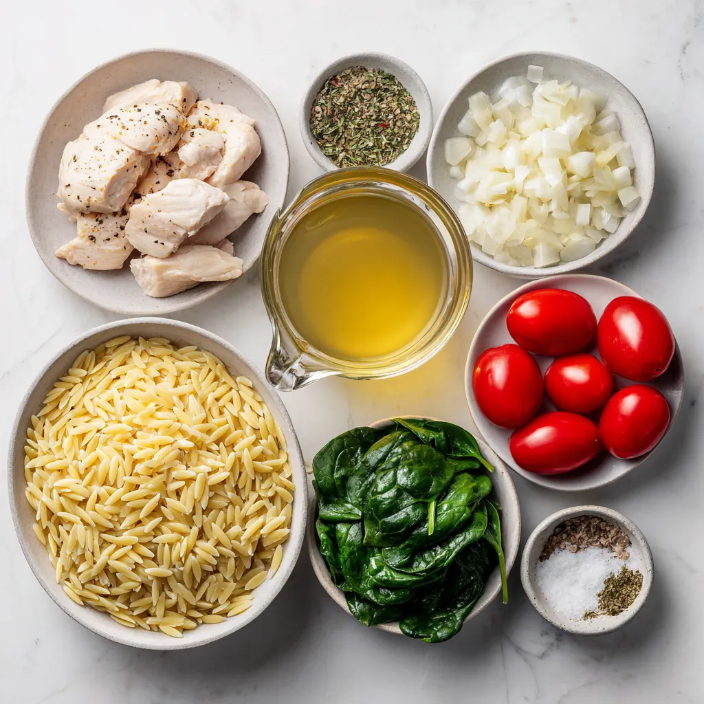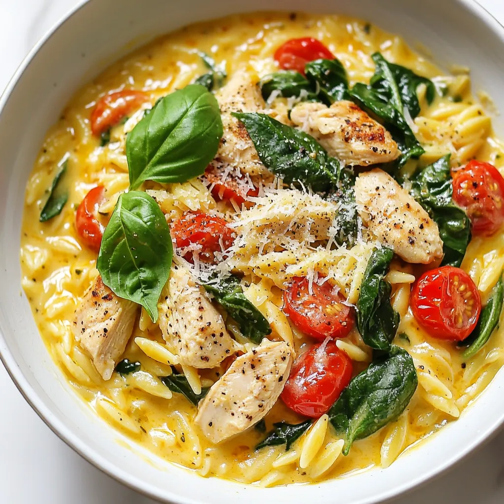 - 2 cups orzo pasta - 1 lb boneless, skinless chicken breasts, diced - 1 tablespoon olive oil - 1 medium onion, finely chopped - 3 cloves garlic, minced - 2 cups chicken broth - 1 cup heavy cream - 1 cup spinach, chopped - 1 cup cherry tomatoes, halved - 1 teaspoon dried oregano - 1 teaspoon garlic powder - Salt and pepper to taste - Fresh basil, for garnish - Grated Parmesan cheese, for serving (optional) You can swap orzo for other pasta types, like penne or fusilli. Use vegetable broth instead of chicken broth for a vegetarian option. If you prefer a lighter dish, substitute heavy cream with half-and-half. Feel free to use frozen spinach instead of fresh; just thaw and drain it before adding. Cherry tomatoes can be replaced with diced bell peppers for a sweet twist. I love using dried oregano for a warm flavor. Garlic powder adds depth without extra prep. Fresh basil gives a bright finish, while Parmesan cheese adds a rich kick. You can also try red pepper flakes for heat. If you want more zest, a squeeze of lemon juice works wonders. {{ingredient_image_1}} To make creamy chicken orzo, start by heating olive oil in a large pot over medium heat. Add diced chicken, season it with salt, pepper, garlic powder, and dried oregano. Cook the chicken for about 5 to 7 minutes. It should turn brown and be cooked through. Remove the chicken and set it aside. Next, add the finely chopped onion and minced garlic to the same pot. Sauté these for about 3 to 4 minutes until they soften. Then, add the orzo pasta and sauté for another minute. This step helps give the orzo a nice toast. Now, pour in 2 cups of chicken broth. Bring it to a simmer, then reduce the heat to low. Cover the pot and let it cook for about 10 minutes. Stir occasionally. You want the orzo to be tender and for most of the liquid to be absorbed. After that, stir in 1 cup of heavy cream, chopped spinach, and halved cherry tomatoes. Cook for another 2 to 3 minutes. This makes the dish creamy and delicious. Finally, return the cooked chicken to the pot. Stir everything together. Taste it and adjust the seasoning if necessary. To ensure your chicken is perfectly cooked, cut it into small, even pieces. This helps it cook faster and more evenly. Use a meat thermometer to check if the chicken reaches 165°F. This temperature keeps it safe to eat. Also, don’t overcrowd the pan when you cook the chicken. If you add too much at once, it may steam instead of brown. Cook it in batches if needed. Stirring is key during the cooking process. It helps prevent the orzo from sticking to the pot. Regular stirring also ensures even cooking and helps blend the flavors well. When you add the chicken broth, stir to mix the orzo and broth evenly. After adding the cream and veggies, stir again. This keeps everything combined and creamy. Remember, a good stir goes a long way in making your dish flavorful and smooth! To get a great creamy texture, use heavy cream. It adds richness and smoothness. Stir the cream in at the end of cooking. This helps it blend well without curdling. You can also add a splash of pasta water if needed. This water helps the sauce stick to the orzo better. One common mistake is overcooking the orzo. Cook it just until tender. If you cook it too long, it can become mushy. Another mistake is not stirring enough. Stirring helps the orzo cook evenly and prevents sticking. Lastly, don’t forget to season your chicken. A little salt and pepper make a big difference. To boost flavor, try adding herbs like thyme or rosemary. Fresh herbs brighten the dish. You can also add lemon juice for a tangy kick. For nutrition, toss in more veggies. Peas, carrots, or bell peppers add color and nutrients. If you want more protein, consider adding beans or chickpeas. They make the meal heartier and healthier. Pro Tips Tip 1: For extra flavor, marinate the chicken in olive oil, garlic, and herbs for at least 30 minutes before cooking. Tip 2: To prevent the orzo from getting mushy, be sure to stir occasionally while it cooks and keep an eye on the liquid level. Tip 3: Feel free to add other vegetables like bell peppers or zucchini for added nutrition and color. Tip 4: For a lighter version, substitute heavy cream with half-and-half or a non-dairy milk option. {{image_2}} You can change the protein in creamy chicken orzo. Shrimp works well. Just cook it in the pot until it turns pink. Tofu is another great choice. Use firm tofu, cut into cubes. Sauté the tofu until it is golden. Both options add unique flavors and textures. To make a vegetarian version, skip the chicken. Use more vegetables instead. You can add mushrooms for a meaty taste. Zucchini and bell peppers also work. These veggies keep the dish hearty and satisfying. Swap chicken broth for vegetable broth. This keeps the creaminess while making it plant-based. Get creative with vegetables in your orzo! Spinach is a great start, but you can add more. Try peas for a sweet touch. Broccoli florets add crunch and color. Carrots can bring a nice sweetness. Just chop them small and add them while cooking. The more veggies, the merrier! Storing creamy chicken orzo is simple. First, let the dish cool to room temperature. Then, transfer it to an airtight container. Make sure to seal it tightly. You can keep it in the fridge for up to three days. This way, you can enjoy it again without losing flavor! When you're ready to eat the leftovers, reheating is key. Place the creamy chicken orzo in a pot over low heat. Add a splash of chicken broth or water to keep it moist. Stir often to heat evenly. You can also use the microwave. Just cover the bowl with a lid or a paper towel. Heat it in short bursts, stirring in between. This will help prevent it from drying out. If you want to freeze creamy chicken orzo, it’s best to do it right after cooking. Use freezer-safe containers or bags. Make sure to leave some space for expansion. You can freeze it for up to three months. When you’re ready to eat, remove it fr