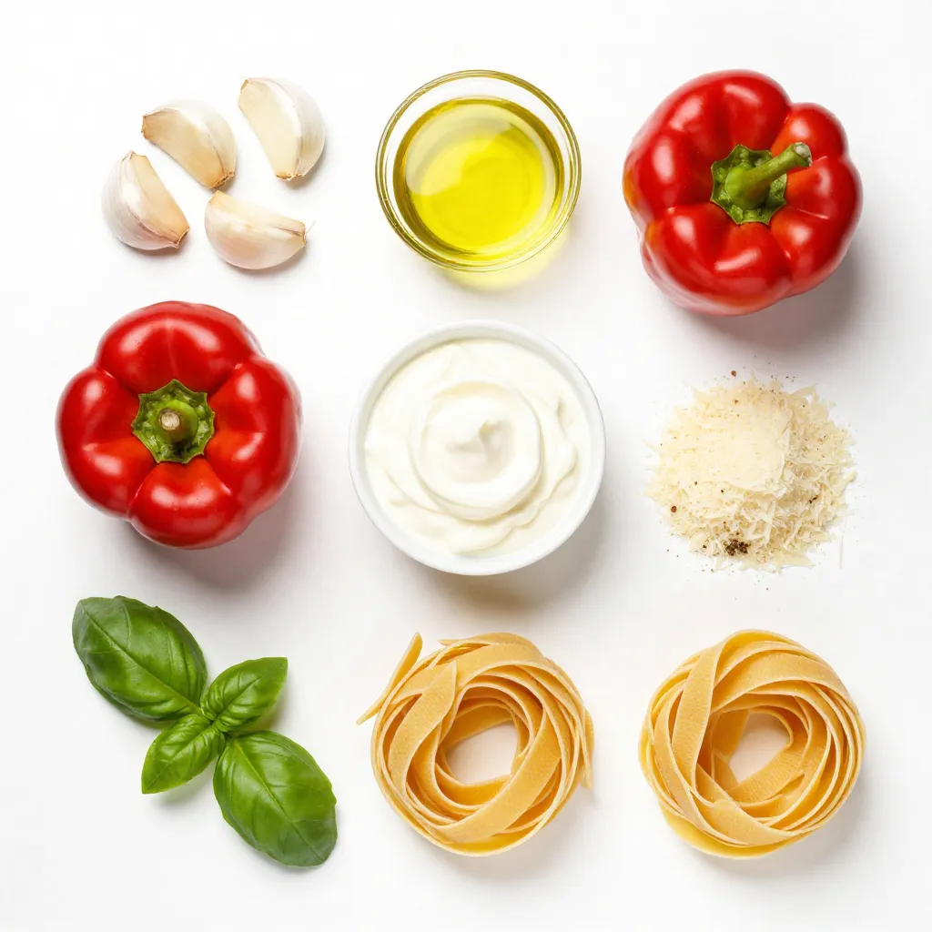 Cooking this creamy roasted red pepper pasta is simple and fun. Here’s what you need: