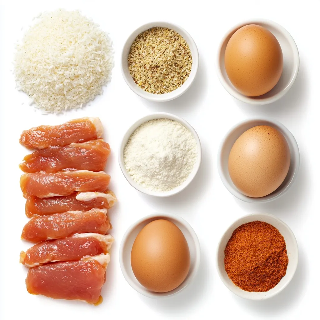 Here are the ingredients you need to make crispy coconut chicken strips. Each item adds its own flavor and texture.