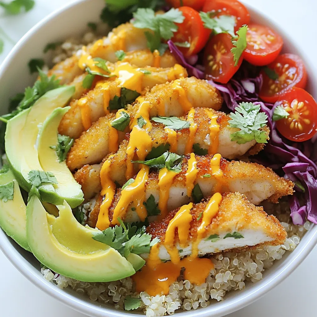 Assemble the Bowls: In a serving bowl, start with a base of cooked brown rice or quinoa. Arrange the crispy fish pieces on top, followed by slices of avocado, shredded red cabbage, and halved cherry tomatoes.