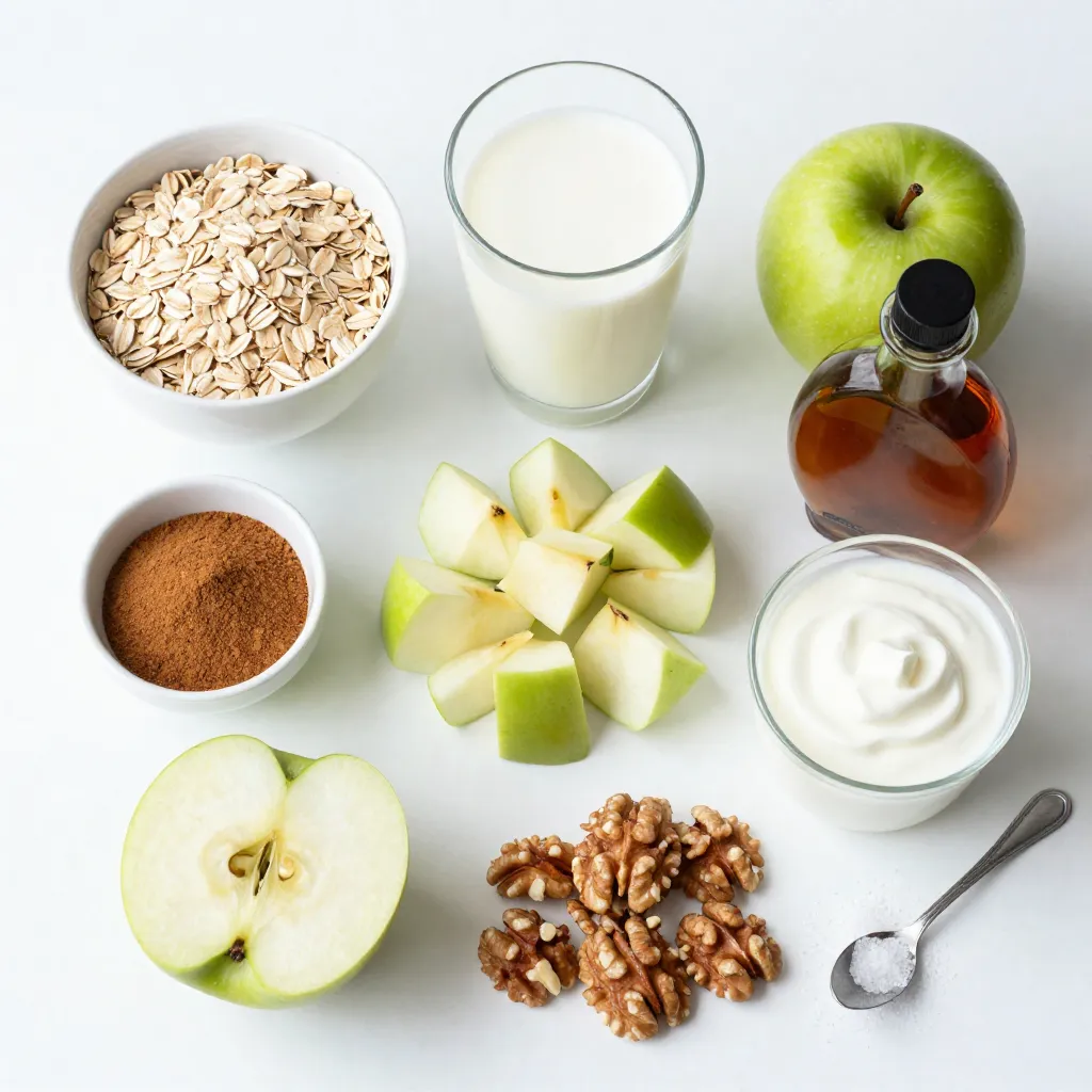 These ingredients make the best apple pie overnight oats. The rolled oats give a hearty base. Almond milk keeps it creamy and dairy-free. Diced apples add sweetness and crunch. Ground cinnamon gives that warm spice flavor. Maple syrup brings out the natural sweetness. Vanilla extract adds a nice touch, and a pinch of salt balances it all.
