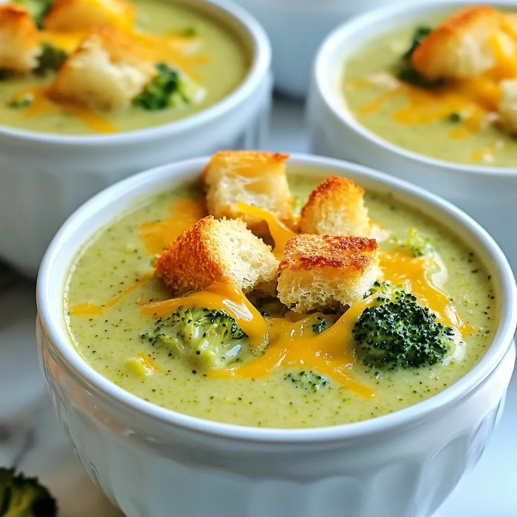 - 1 large head of broccoli, chopped into small florets - 1 medium onion, diced - 2 cloves garlic, minced - 4 cups vegetable broth - 2 cups shredded sharp cheddar cheese - 1 cup heavy cream These main ingredients make your soup creamy and tasty. The broccoli adds nutrition and color. The onion and garlic bring in great flavor. The vegetable broth forms the soup base. Sharp cheddar cheese adds a rich and cheesy taste. Heavy cream gives it a smooth texture. - 2 tablespoons olive oil - 1 teaspoon thyme (fresh or dried) - Salt and pepper to taste - Croutons for garnish Optional ingredients can enhance your soup. Olive oil helps cook the onions well. Thyme adds a nice herbal note. Salt and pepper are key for flavor balance. Croutons make a crunchy topping. You can mix and match these ingredients to suit your taste. {{ingredient_image_1}} First, let’s chop the broccoli. Take one large head of broccoli and cut it into small florets. This helps the broccoli cook evenly and blend well. Next, dice one medium onion into small pieces. Then, mince two cloves of garlic. This adds great flavor. Now, you have a choice of tools for blending. An immersion blender is great for this soup. You can blend it right in the pot. It’s easy and quick. If you use a regular blender, be careful. Blend in small batches to avoid spills. Start cooking by heating two tablespoons of olive oil in a large pot over medium heat. Add the diced onion and sauté it for about five minutes. The onion should look clear and soft. Then, add the minced garlic and one teaspoon of thyme. Cook for another one to two minutes. This brings out the flavors. Next, add the chopped broccoli and four cups of vegetable broth to the pot. Bring it to a boil, then lower the heat. Let it simmer for about 15 to 20 minutes. You want the broccoli to be tender. After cooking, blend the soup until it is smooth. If you used an immersion blender, you’re all set. If not, pour the soup into a regular blender in batches. When smooth, return the soup to the pot. Stir in one cup of heavy cream and two cups of shredded sharp cheddar cheese. Keep mixing until the cheese melts completely. Finally, add salt and pepper to taste. If the soup seems thick, add more broth or water to thin it. Let it simmer for five more minutes to warm everything through. Enjoy this creamy goodness! To boost flavor, pick sharp cheddar cheese. Sharp cheddar adds depth and tang. It makes the soup rich and tasty. I recommend using freshly shredded cheese. Pre-shredded cheese contains additives that can affect melting. Proper seasoning also matters. Start with salt and pepper. Taste as you go. If you want more flavor, add a pinch of garlic powder. You might also try a dash of hot sauce for heat. For a creamier soup, use heavy cream. It adds richness and smoothness. Stir it in slowly while heating the soup. This method keeps the cream from curdling. To achieve a smoother texture, use an immersion blender. Blend until it reaches your desired consistency. If you don't have one, pour the soup into a regular blender. Blend in batches to avoid spills. If the soup feels too thick, add more vegetable broth. Thin it out until it’s just right. Pro Tips Use Fresh Broccoli: Fresh broccoli will give the best flavor and texture to your soup. Look for bright green florets and firm stalks. Cheese Choices: While sharp cheddar is traditional, feel free to mix in other cheeses like Gruyère or Monterey Jack for a unique flavor profile. Adjust Creaminess: If you prefer a lighter soup, you can substitute half of the heavy cream with milk or use a lower-fat cream alternative. Garnish for Texture: Adding croutons not only enhances the presentation but also provides a delightful crunch that balances the creaminess of the soup. {{image_2}} You can easily adjust this soup for different diets. If you want a vegan option, use dairy-free cheese. Coconut cream can replace heavy cream for a rich texture. Both options make a creamy soup without dairy. For gluten-free needs, check your broth and cheese. Most vegetable broths are gluten-free. Just ensure the cheese is also free from gluten. You can add many flavors to this soup. Fresh herbs like basil or parsley brighten the taste. A sprinkle of paprika adds a warm kick. You might also try spices like cumin or coriander for unique flavors. Incorporating other vegetables can boost nutrition too. Carrots and celery can add sweetness. Cauliflower blends well and keeps the soup creamy. Peas can add a pop of color and flavor. Mix and match to create your perfect bowl! To store leftover soup, let it cool first. Pour it into a container with a tight lid. This helps keep it fresh. You can store it in the fridge for up to four days. When you are ready to eat, reheat it on the stove. Stir it often to avoid burning. You can also use a microwave. Just heat it in short bursts, stirring in between. To freeze broccoli cheddar soup, let it cool completely. Pour it into freezer-safe bags or containers. Leave some space at the top, as it will expand. This soup stays good in the freezer for up to three months. When you want to eat it, take it out and place it in the fridge overnight to thaw. For quick thawing, you can use the microwave. Reheat it gently on the stove, stirring well before serving. You can use both fresh and frozen broccoli. Fresh broccoli offers a crisp taste. Frozen broccoli is convenient and still tasty. Both options work well in this soup. To add spice, try adding red pepper flakes or cayenne pepper. You can also use a splash of hot sauce. Start small and adjust to your heat level. This soup pairs well with crusty bread or a fresh salad. Grilled cheese sandwiches also make a nice side. You can add croutons for extra crunch. The soup lasts about 3-4 days in the fridge. Store it in an airtight container. Reheat gently on the stove or in the microwave. Yes, you can make this soup in a slow cooker. Sauté the onions and garlic first. Then, add all ingredients to the slow c