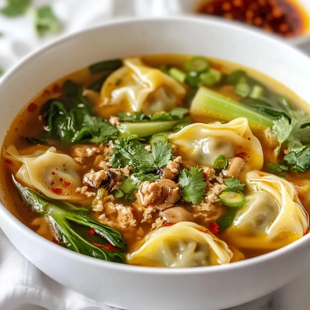 Now it’s time to serve your soup. Taste the broth and add more salt or pepper if needed. Ladle the hot soup into bowls. For a fresh touch, garnish with cilantro. If you like some heat, drizzle chili oil on top. Enjoy your warm and cozy wonton soup!