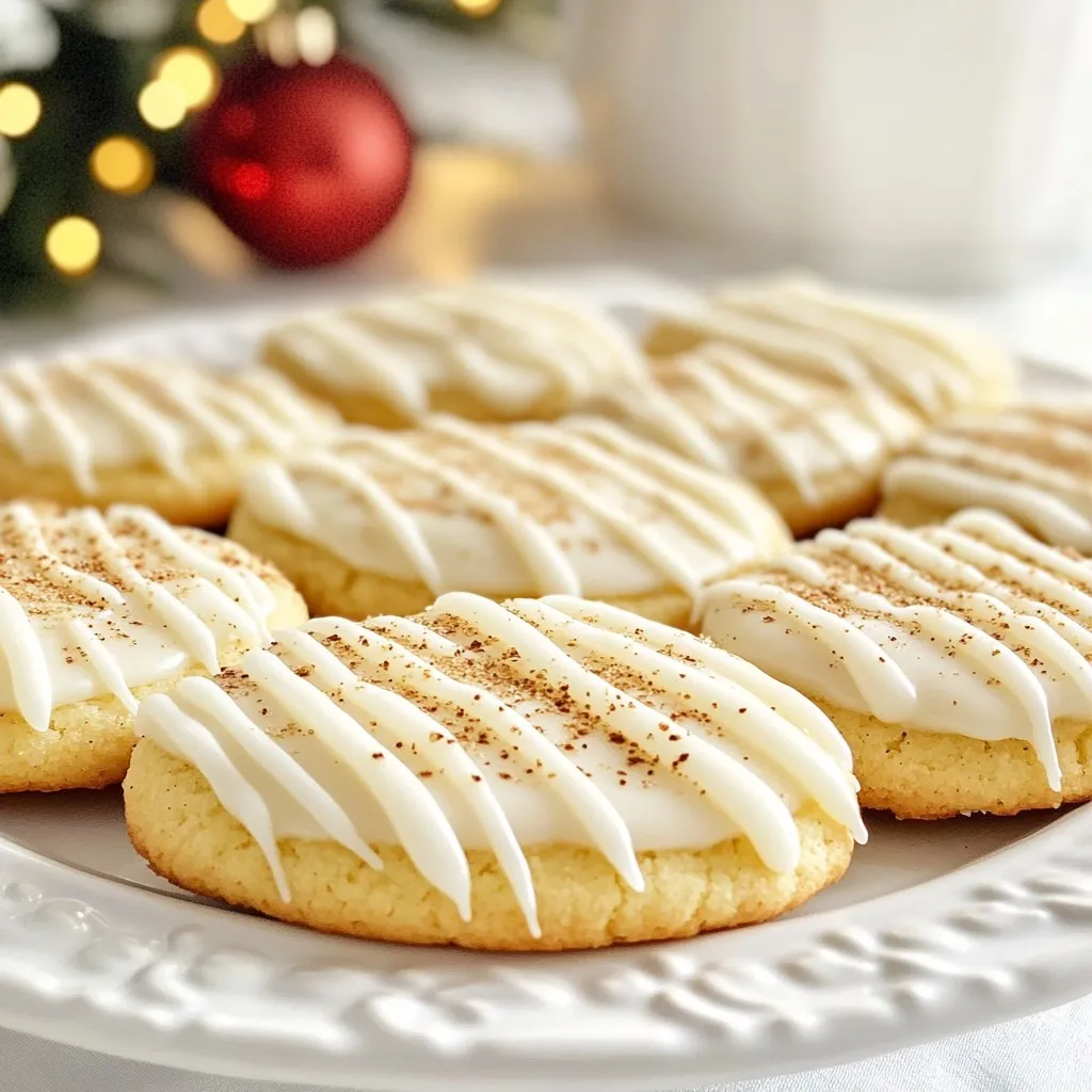 - 2 ¾ cups all-purpose flour - 1 teaspoon baking powder - ½ teaspoon baking soda - ½ teaspoon ground nutmeg - ½ teaspoon ground cinnamon - 1 cup unsalted butter, softened - 1 cup granulated sugar - 1 large egg - 1 teaspoon vanilla extract - ¾ cup eggnog - 1 cup powdered sugar (for icing) - Extra nutmeg and cinnamon for garnish When making eggnog sugar cookies, choose fresh ingredients for the best taste. Look for: - Butter: Use unsalted butter; it gives you control over the salt. - Eggnog: Pick a rich, creamy eggnog for a full flavor. Organic or homemade is often best. - Spices: Freshly ground nutmeg and cinnamon provide a stronger flavor. Check the expiration dates on your spices. You can make this recipe your own with simple swaps: - Flour: For a gluten-free option, try a 1:1 gluten-free flour blend. - Sugar: Coconut sugar or brown sugar can add a deeper flavor. - Egg: Use a flax egg (1 tablespoon flaxseed meal + 2.5 tablespoons water) for a vegan option. - Butter: For dairy-free, use a plant-based butter or coconut oil. These tips help you create cookies that fit your taste and dietary needs. Enjoy baking! {{ingredient_image_1}} Start by preheating your oven to 350°F (175°C). This makes sure your cookies bake evenly. Next, line your baking sheets with parchment paper. This helps the cookies not stick and makes cleanup easy. In a medium bowl, whisk together the flour, baking powder, baking soda, nutmeg, and cinnamon. Mixing these dry ingredients first helps to spread the flavors evenly. Set this bowl aside for later. In a large bowl, cream the softened butter and granulated sugar using an electric mixer. Mix until the mixture looks light and fluffy. This step is key for a soft texture in your cookies. Now, beat in the egg, vanilla extract, and eggnog into the butter and sugar. Mix well until everything is combined smoothly. Gradually add the dry mixture to this wet mixture. Mix just until combined. Be careful not to overmix; it can make your cookies tough. Use a cookie scoop or a tablespoon to drop the dough onto the prepared baking sheets. Leave about 2 inches between each cookie. This spacing allows them to spread while baking. Bake the cookies for 10-12 minutes, or until the edges turn golden. Once baked, let them cool on the sheet for 5 minutes, then transfer to a wire rack. In a small bowl, mix powdered sugar with a few tablespoons of eggnog. Stir until smooth. Adjust the icing consistency with more eggnog or powdered sugar as needed. Once your cookies are cool, drizzle the icing over them. Finish by sprinkling a pinch of nutmeg and cinnamon on top for extra flavor and a festive touch. To get soft and chewy cookies, you need to cream the butter and sugar well. Mix until it feels light and fluffy. This step adds air to the dough. When you mix in the eggnog, it helps keep cookies moist. Make sure not to overmix after adding the dry ingredients. A few lumps are okay. This keeps the cookies tender. One mistake is baking cookies too long. Keep an eye on them. They should be just golden at the edges. If you wait until they look brown, they may be dry. Another mistake is using cold butter. Always soften it first. Cold butter won’t mix well and leads to hard cookies. Lastly, don’t skip the eggnog. It adds flavor and moisture. When icing, start with cooled cookies. Warm cookies will melt your icing. Mix the powdered sugar with eggnog until smooth. Aim for a drizzle-able consistency. If it’s too thick, add more eggnog. If it’s too thin, add more powdered sugar. Drizzle the icing on top and sprinkle with extra nutmeg and cinnamon. This makes them look pretty and tasty. Pro Tips Chill the Dough: For thicker cookies, chill the dough for at least 30 minutes before baking. This helps the cookies hold their shape and enhances the flavors. Use Fresh Spices: Always opt for fresh ground nutmeg and cinnamon for the best flavor. Fresh spices can significantly elevate the taste of your cookies. Perfect Icing Consistency: When making the icing, start with less eggnog and gradually add more until you reach the desired consistency. It should be thick enough to hold its shape but still smooth for drizzling. Decorative Touch: Add a pinch of cinnamon and nutmeg on top of the icing for an eye-catching finish and additional flavor. This small step makes a big visual difference! {{image_2}} You can make eggnog sugar cookies even better. Try adding ginger for warmth. A half teaspoon works well. You can also add cloves or allspice for a cozy touch. If you want a twist, use orange zest. It gives a bright flavor that pairs nicely with the eggnog. Experiment with different spices to find your favorite mix. If you need a gluten-free option, swap all-purpose flour for gluten-free flour. Make sure it’s a blend meant for baking. This helps keep the texture light and fluffy. Use the same amount, 2 ¾ cups. The cookies will still taste great and fit your diet. Enjoy the holiday flavors without worrying! You can change up the icing for fun. Instead of eggnog icing, use cream cheese icing for a richer flavor. Mix 4 ounces of cream cheese with powdered sugar and a bit of milk. It gives a tangy twist. You can also top the cookies with crushed candy canes or chocolate chips. These add a fun crunch and make your cookies pop! To keep your eggnog sugar cookies fresh, store them in an airtight container. Line the container with parchment paper to avoid sticking. You can also add a slice of bread to keep them soft. This helps absorb moisture. When stored properly, these cookies last about one week at room temperature. If you keep them in the fridge, they can last up to two weeks. Just make sure they are well-sealed to prevent drying out. To freeze your eggnog sugar cookies, place them in a single layer on a baking sheet. Freeze until solid, then transfer them to a freezer-safe bag. They can last up to three months in the freezer. When you're ready to enjoy, thaw them at room temperature. Then, add icing before serv