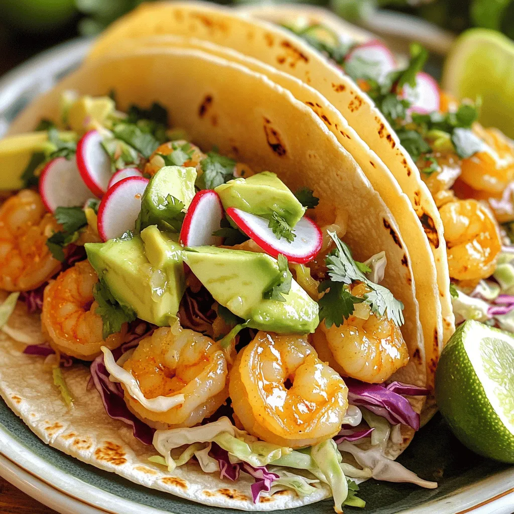 Now, it’s time to build your tacos! On each tortilla, place a portion of the garlic butter shrimp. Top with a handful of shredded cabbage and a few slices of avocado. Garnish with fresh cilantro for that bright flavor. For an extra crunch, add sliced radishes on top. Serve the tacos on a colorful platter with lime wedges. Guests can squeeze lime over their tacos for added zest. This presentation makes the dish inviting and fun!