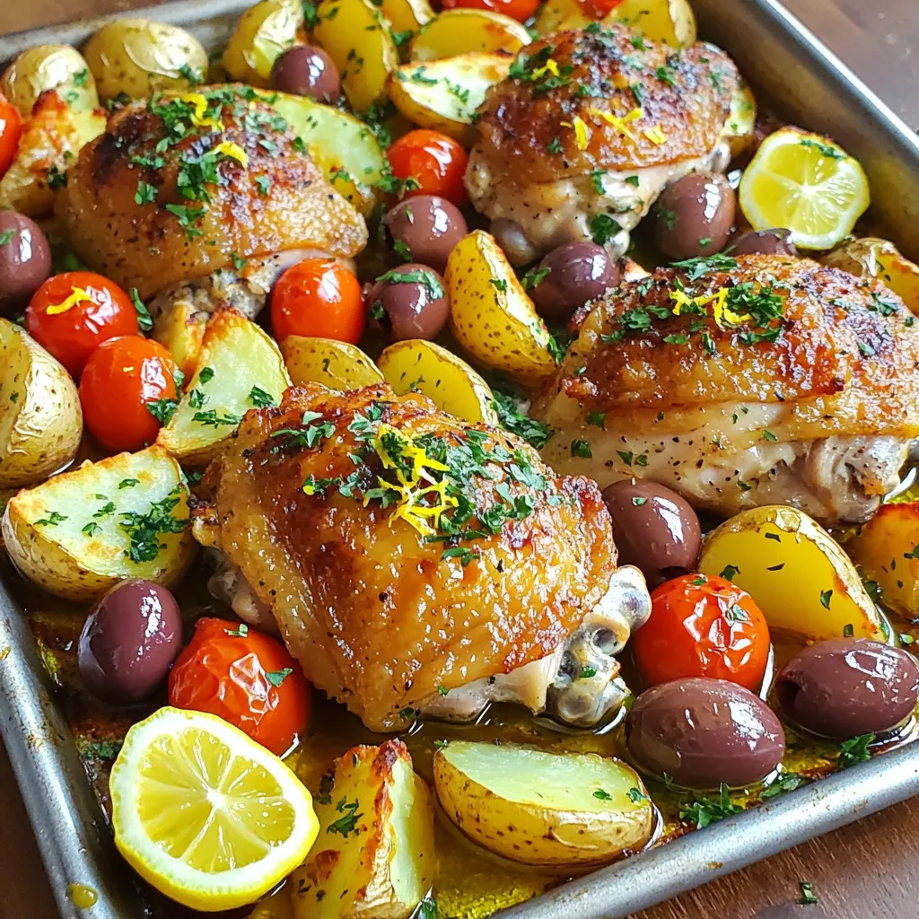 Now, it’s time to put it all together. Nestle the marinated chicken thighs among the potato wedges on the sheet pan. Scatter cherry tomatoes and Kalamata olives around the chicken and potatoes. This adds color and flavor, making the dish more appealing.