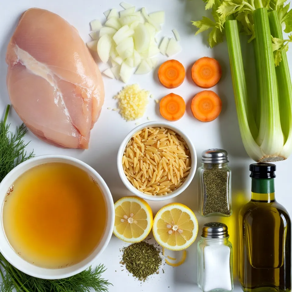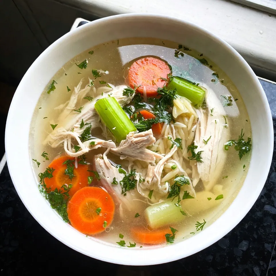 A comforting and flavorful soup made with chicken, vegetables, and orzo pasta, brightened with lemon.