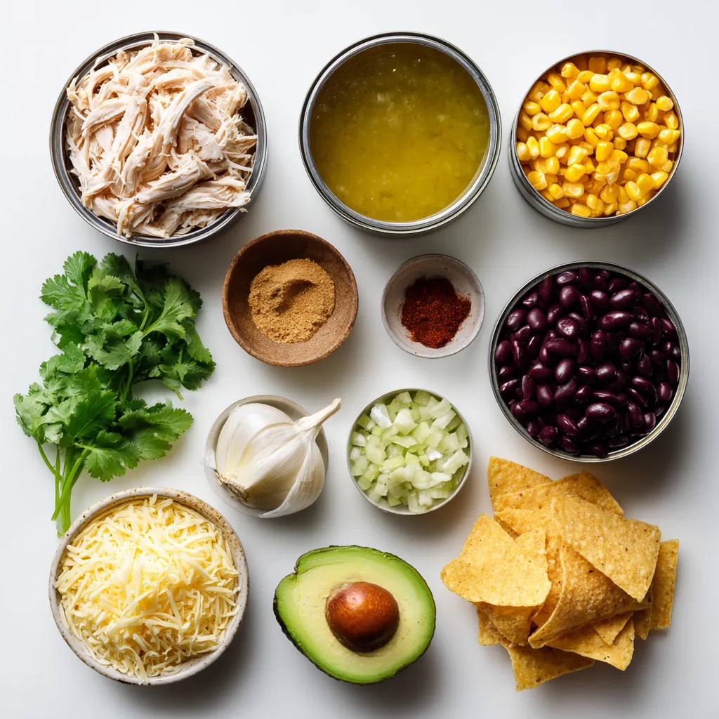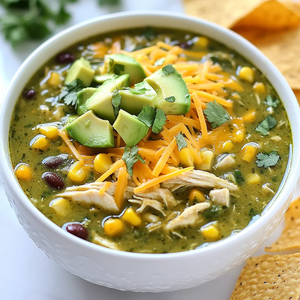 - 2 cups cooked chicken, shredded - 1 can (15 oz) green enchilada sauce - 4 cups chicken broth - 1 cup corn (canned or frozen) - 1 can (14 oz) black beans, rinsed and drained - 1 medium onion, diced - 3 cloves garlic, minced - 1 teaspoon cumin - 1 teaspoon smoked paprika - Salt and pepper to taste - 1 cup shredded cheese (like Monterey Jack or Mexican blend) - 1/4 cup fresh cilantro, chopped (for garnish) - 2 avocados, diced (for topping) - Tortilla chips (for serving) You can switch out chicken for turkey or even tofu for a vegetarian twist. If you want a different flavor, try a red enchilada sauce. For a vegan version, use vegetable broth and skip the cheese. You can also use fresh corn instead of canned or frozen. If you can’t find black beans, pinto beans work just as well. Always choose fresh herbs for the best flavor. Look for bright green cilantro with no brown spots. When picking avocados, choose ones that are slightly soft but not mushy. Fresh garlic should feel firm. Use a whole onion instead of pre-diced for a stronger taste. When selecting chicken, rotisserie chicken saves time and adds great flavor. {{ingredient_image_1}} Start by gathering all your ingredients. You will need: - 2 cups cooked chicken, shredded - 1 can (15 oz) green enchilada sauce - 4 cups chicken broth - 1 cup corn (canned or frozen) - 1 can (14 oz) black beans, rinsed and drained - 1 medium onion, diced - 3 cloves garlic, minced - 1 teaspoon cumin - 1 teaspoon smoked paprika - Salt and pepper to taste - 1 cup shredded cheese (like Monterey Jack or Mexican blend) - 1/4 cup fresh cilantro, chopped (for garnish) - 2 avocados, diced (for topping) - Tortilla chips (for serving) Chop the onion and mince the garlic. This step adds great flavor to your soup. Heat a drizzle of olive oil in a large pot over medium heat. Add the diced onion and sauté for about 5 minutes. You want it to be soft and clear. Next, add the minced garlic. Cook for one more minute. You will smell a nice aroma! Now it’s time to add the chicken broth. Bring it to a simmer. Pour in the green enchilada sauce. Then, add the shredded chicken, corn, and black beans. Stir in the cumin, smoked paprika, salt, and pepper. Mix everything well and let it simmer for about 15-20 minutes. This helps all the flavors blend together. After simmering, taste the soup. Adjust the seasoning if needed. Serve the soup hot. Top it with shredded cheese, diced avocados, and chopped cilantro. This adds a fresh touch! Don’t forget the tortilla chips for dipping. They add a nice crunch and flavor. Enjoy your meal! To boost flavor in your green enchiladas chicken soup, use fresh herbs. Fresh cilantro adds a bright touch. You can also squeeze lime juice for extra zest. Consider roasting the garlic before adding it to the pot. Roasting makes it sweet and rich. For a little heat, add jalapeños or chipotle peppers. They give the soup a nice kick. Don’t forget to taste as you go. Adjust the salt and pepper for the best results. One common mistake is not sautéing the onion long enough. The onion should be soft and sweet. If you skip the simmering time, the flavors won't blend well. Be sure to let the soup simmer for at least 15 minutes. Also, do not skip the seasoning. A little salt and pepper can make a big difference. Lastly, avoid using pre-shredded cheese. It often has anti-caking agents that can affect melting. You need a large pot for this recipe. A sturdy wooden spoon helps in mixing without scratching the pot. A sharp knife makes dicing the onion and garlic easier. Measuring cups and spoons ensure you use the right amounts. A ladle is helpful for serving the soup. If you love garnishes, have a cutting board ready for the avocado and cilantro. Pro Tips Use Rotisserie Chicken: For a quicker option, use store-bought rotisserie chicken to save time on cooking and shredding the chicken. Customize Your Heat: Adjust the spiciness of the soup by using a spicier green enchilada sauce or adding diced jalapeños for extra heat. Fresh Herbs Matter: Adding fresh cilantro right before serving enhances the flavor of the soup; consider also adding lime juice for a bright touch. Make It Creamy: For a creamier soup, stir in a dollop of sour cream or cream cheese just before serving. {{image_2}} You can easily make a vegetarian version of this soup. Just swap the chicken for extra vegetables. Use mushrooms, zucchini, or bell peppers for great taste. You can also add more beans, like pinto or kidney beans. This will give you protein and fiber. Use vegetable broth instead of chicken broth. It will keep the flavor rich and tasty. If you like heat, try adding jalapeños or green chilies. Chop them up and throw them in during cooking. You can also use spicy green enchilada sauce. This will kick up the spice level. If you want even more heat, add a dash of hot sauce before serving. It will make your soup extra exciting! You can personalize your soup with more ingredients. Try adding a cup of diced tomatoes for freshness. Fresh corn adds sweetness, and you can use it instead of canned corn. If you love cheese, mix in different types like queso fresco or pepper jack. For crunch, top your soup with tortilla strips or crushed tortilla chips. Each addition will make your soup unique and tasty! To keep your green enchiladas chicken soup fresh, let it cool. Then, pour it into an airtight container. Store it in the fridge for up to three days. If you want to keep it longer, consider freezing it. When you’re ready to enjoy your soup again, grab a pot. Pour the soup in and heat it over medium heat. Stir often to avoid sticking. You can also use the microwave. Place the soup in a microwave-safe bowl. Heat it for one to two minutes, stirring halfway through. Ensure it’s hot all the way through before eating. Freezing this soup is easy! After cooking, let it cool completely. Then, ladle it into freezer-safe bags or containers. Remove as much air as you can before sealing. You can freeze it fo