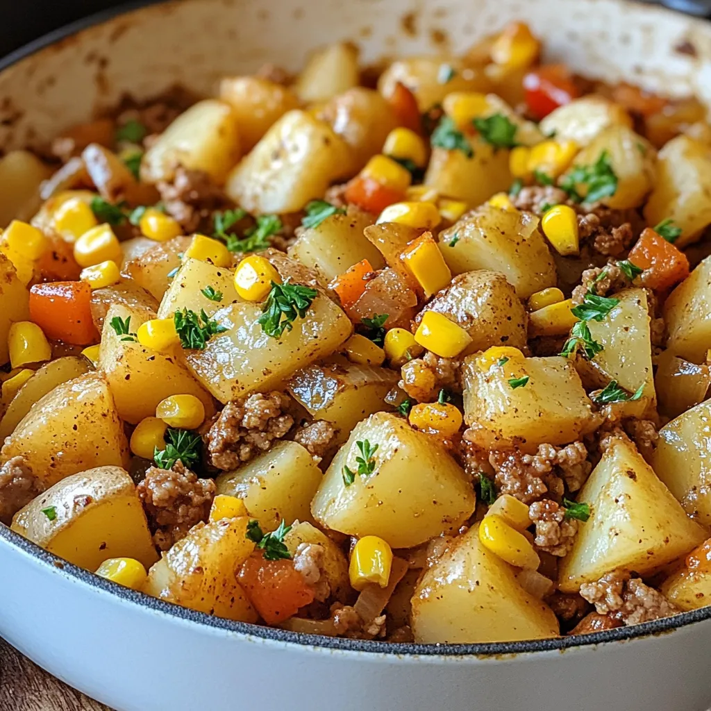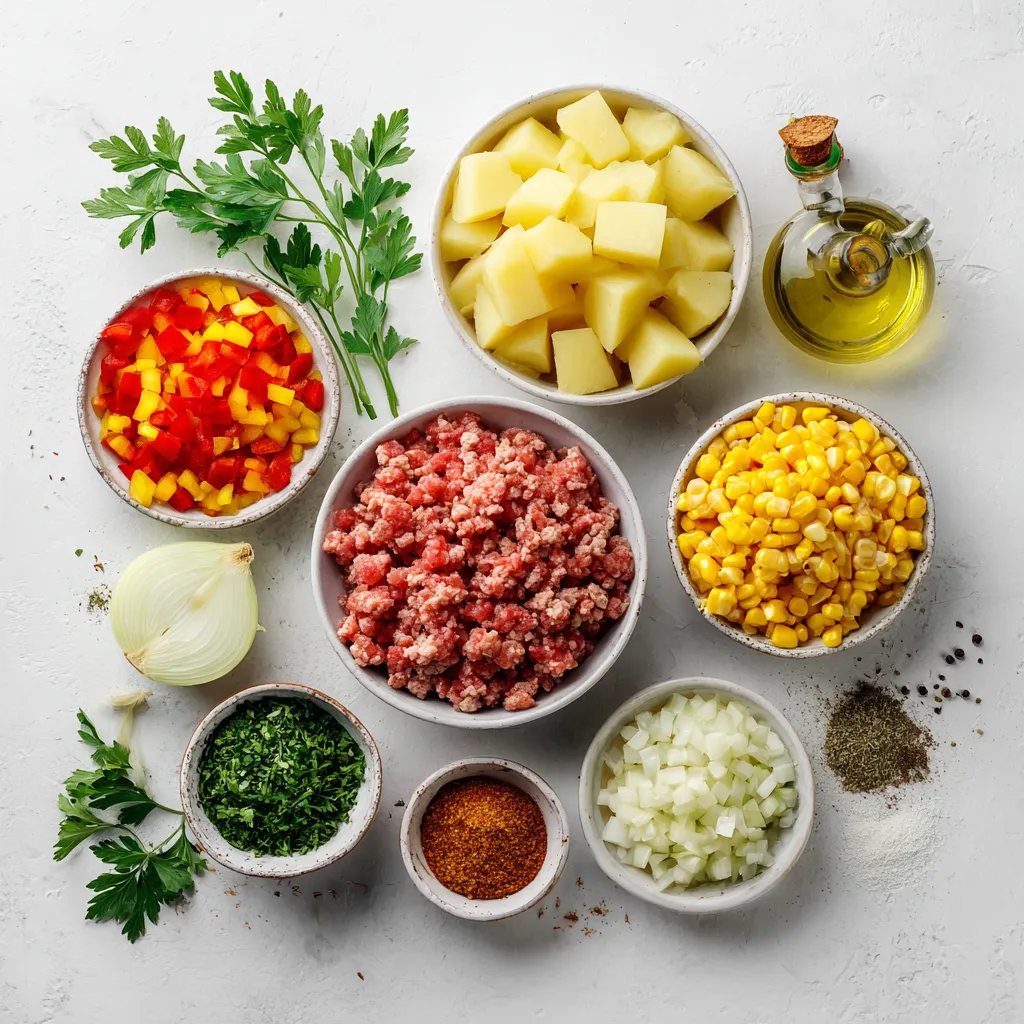 Gathering the right ingredients is key to a great meal. I love using ground turkey because it is lean and tasty. Yukon Gold potatoes add a creamy texture. Chopped onion and bell pepper bring a sweet, savory base. Minced garlic adds a punch of flavor. Corn gives a nice crunch, whether fresh or frozen.