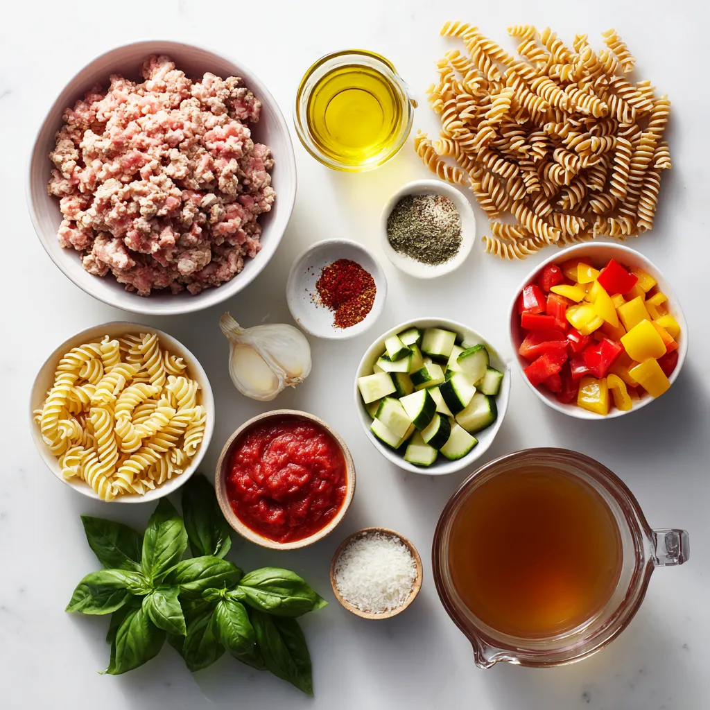 These ingredients come together to create a dish that is both tasty and filling. The ground turkey provides a lean protein option, while the whole wheat pasta adds fiber. Use fresh veggies like onions, garlic, bell peppers, and zucchini for color and flavor.