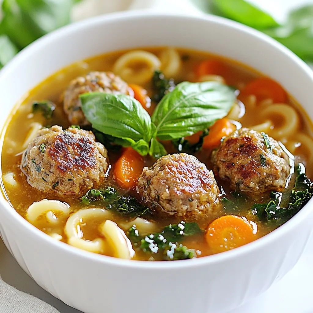- 1 lb ground beef - 1/2 lb ground pork - 1/2 cup breadcrumbs - 1/4 cup grated Parmesan cheese - 1 large egg - 2 cloves garlic, minced - 1 teaspoon dried oregano - 1 teaspoon dried basil - Salt and pepper, to taste - 8 cups beef broth - 1 can (14 oz) diced tomatoes (with juice) - 2 cups sliced carrots - 2 cups chopped kale or spinach - 1 cup small pasta (like ditalini or orzo) - 2 tablespoons olive oil - Fresh basil leaves for garnish The heart of my Hearty Italian Meatball Soup lies in its main ingredients. I start with proteins: ground beef and pork. They blend well, offering rich flavors and moisture. The breadcrumbs and egg help bind the meatballs and keep them juicy. Garlic, oregano, and basil add depth and warmth to every bite. The beef broth and diced tomatoes create a savory base for the soup, while carrots and greens bring freshness and color. - Additional seasonings - Vegetarian substitutes - Garnishes You can add extra seasonings for more flavor. A pinch of red pepper flakes can spice things up. If you want a meatless option, try using lentils or chickpeas instead of meat. For garnishes, fresh basil leaves or a sprinkle of Parmesan cheese can make your soup look and taste amazing. - Large pot - Mixing bowl - Plate for meatballs - Ladle or serving spoon For this recipe, you will need a large pot to cook the soup and a mixing bowl for the meatballs. A plate helps hold the formed meatballs before cooking. A ladle or serving spoon is handy for serving. Having these tools ready will make your cooking easier and more fun. {{ingredient_image_1}} Mixing ingredients Start by taking a large mixing bowl. Add 1 pound of ground beef and 1/2 pound of ground pork. Next, mix in 1/2 cup of breadcrumbs and 1/4 cup of grated Parmesan cheese. Crack 1 large egg into the bowl. Then, add 2 minced garlic cloves, 1 teaspoon of dried oregano, and 1 teaspoon of dried basil. Season with salt and pepper to taste. Use your hands to mix everything until it is well combined. Forming meatballs Once your mixture is ready, take small portions and roll them into balls. Aim for about 1 inch in diameter. Place the formed meatballs on a plate. This step is fun and helps you feel connected to your food. Browning meatballs Heat 2 tablespoons of olive oil in a large pot over medium heat. Once the oil is hot, gently add the meatballs to the pot. Brown them on all sides for about 5 minutes. This adds great flavor and texture. After browning, remove the meatballs and set them aside. Building the soup base In the same pot, add 2 cups of sliced carrots. Cook them for about 3 minutes until they start to get soft. Then, pour in 8 cups of beef broth and a can of diced tomatoes (14 oz) with their juice. Bring this mixture to a simmer. The aroma will fill your kitchen and excite your taste buds. Adding vegetables and pasta After the soup base simmers, return the browned meatballs to the pot. Let them simmer for 15 minutes. Then, stir in 2 cups of chopped kale or spinach and 1 cup of small pasta, like ditalini or orzo. This adds color and nutrition to your soup. Simmering times Cook everything for an additional 10 to 12 minutes, or until the pasta is al dente. Taste the soup and adjust the seasoning with more salt and pepper if needed. This final step ensures every bite is packed with flavor. To make great meatballs, start with the right mix. I use both ground beef and ground pork. This blend adds depth and flavor. The pork keeps the meatballs moist, which is key for tenderness. - Techniques for flavor: - Add minced garlic and dried herbs like oregano and basil. These give your meatballs a tasty kick. - Grated Parmesan cheese adds a nice umami flavor. - Ensuring tenderness: - Don't overmix the meat. Mix until just combined. - Use a light hand when forming meatballs. Aim for about one inch in size. When cooking the soup, you want the right thickness and flavor. - Adjusting for thickness: - If you like a thicker soup, add less broth. You can also let it simmer longer to reduce it. - Use small pasta like ditalini or orzo to help thicken the soup as well. - Flavor enhancing tips: - Sauté the carrots before adding broth. This builds a richer flavor base. - Don’t forget to taste! Add salt and pepper to enhance the soup's taste. How you serve this soup can make it even better. - Best accompaniments: - Pair it with crusty bread. It’s perfect for dipping! - A simple salad on the side adds freshness. - Presentation ideas: - Garnish each bowl with fresh basil leaves. This adds a pop of color. - Serve in large bowls to show off the hearty meatballs and veggies. Pro Tips Use Fresh Herbs: Fresh basil adds a bright flavor to the soup. Consider adding it at the end of cooking to preserve its vibrant taste. Customize the Meatballs: Feel free to mix in other meats like turkey or chicken, or add spices such as red pepper flakes for a kick. Make it Ahead: This soup tastes even better the next day! Make a big batch and store leftovers in the refrigerator for easy meals. Perfect Pasta Cooking: To avoid mushy pasta, add it to the soup during the last 10-12 minutes of cooking so it remains al dente. {{image_2}} You can change the meat in the meatballs. Try turkey or chicken instead of beef and pork. These options make the soup leaner. They still taste great! You can also make meatless meatballs. Use lentils or chickpeas. You can blend them with spices. This will give you a hearty flavor without meat. If you need gluten-free options, use gluten-free breadcrumbs. They work just as well in the meatballs. You can also skip the pasta or use gluten-free pasta. This way, everyone can enjoy the soup. For low-carb diets, replace the pasta with zucchini noodles. You can spiralize zucchini into thin strips. This keeps the soup light yet filling. Want some heat? Add red pepper flakes to the soup. This gives it a nice kick. You can also try different herbs and spices. Swap basil for thyme or rosemary. Each one will change the flavor in a fun way. You can even 