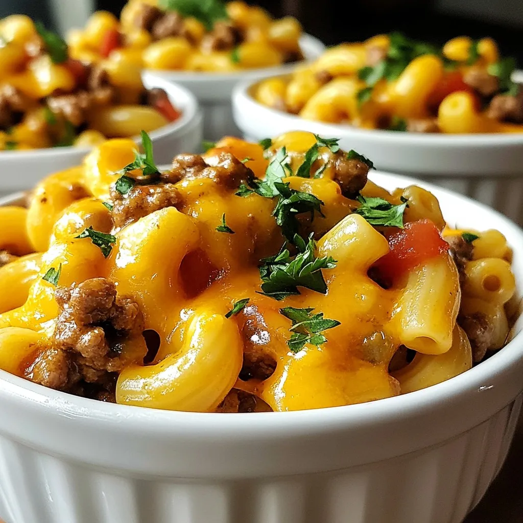 A creamy and cheesy one-pot meal featuring ground beef, macaroni, and a blend of savory ingredients.