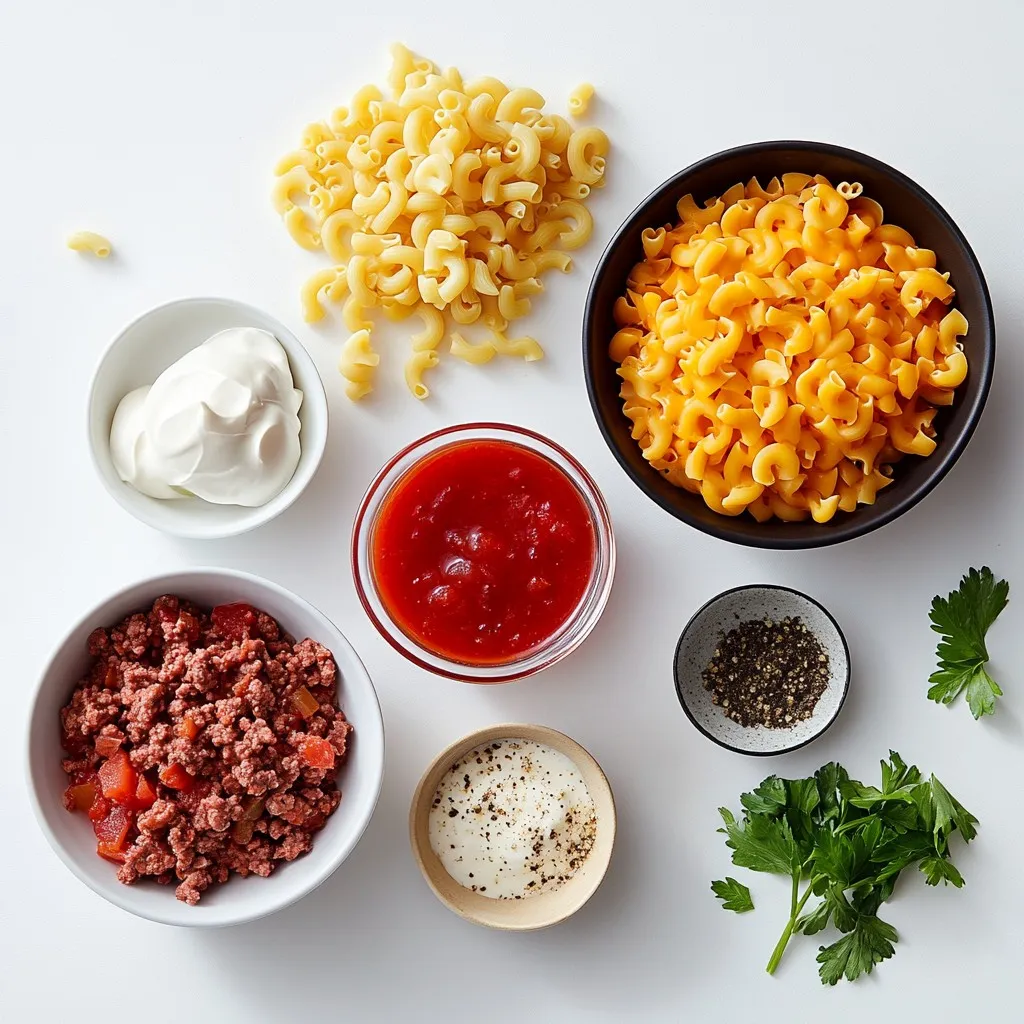 - 1 pound ground beef - 2 cups elbow macaroni - 4 cups beef broth - 1 small onion, diced - 3 cloves garlic, minced - 2 teaspoons Worcestershire sauce - 1 cup shredded cheddar cheese - 1/2 cup sour cream - Fresh parsley, chopped for garnish Homemade One-Pot Hamburger Helper starts with simple, fresh ingredients. The main star is ground beef, which gives the dish its savory flavor. I choose 80/20 beef for the right mix of fat and meat. This balance makes the dish juicy and delicious. Next, I add elbow macaroni. It cooks perfectly in the broth, soaking up all the flavor. The beef broth adds depth and richness. It is the base for the entire meal. To boost the flavor, I use a small onion and garlic. Diced onion adds sweetness and makes the dish aromatic. Minced garlic gives it a punch. Together, they create a savory base. Worcestershire sauce adds a unique tang. Just two teaspoons bring a lot of flavor. I also use diced tomatoes for freshness. They add a nice texture and a bit of acidity. For the creamy finish, I mix in shredded cheddar cheese and sour cream. The cheese melts into the dish, making it gooey. Sour cream adds a rich, tangy taste. Finally, I garnish with fresh parsley for a pop of color and freshness. Each ingredient plays a role in making this meal satisfying and tasty. {{ingredient_image_1}} Start by warming a large pot or Dutch oven over medium heat. Add 1 pound of ground beef, along with 1 small diced onion and 3 minced garlic cloves. Cook this mix until the beef is brown and the onion is clear. This should take about 5 to 7 minutes. Once the meat is cooked, drain any extra fat from the pot. This step keeps your dish from being greasy and helps the flavors shine. Now it's time to add the fun stuff. Toss in 2 cups of elbow macaroni, 4 cups of beef broth, and 1 cup of diced tomatoes. You can use either canned or fresh tomatoes, depending on what you have. Also, add in 2 teaspoons of Worcestershire sauce, 1 teaspoon of smoked paprika, and 1/2 teaspoon of black pepper. Stir everything well to mix all the flavors. Bring this mixture to a boil, then lower the heat. Cover the pot and let it simmer. This should take about 12 to 15 minutes. Stir occasionally to make sure the pasta cooks evenly. The macaroni should be tender and most of the liquid should be gone when you finish. Once the macaroni is ready, take the pot off the heat. Stir in 1 cup of shredded cheddar cheese and 1/2 cup of sour cream. This will make the dish creamy and cheesy. Mix until everything melts together. For a nice touch, sprinkle fresh chopped parsley on top before serving. This adds color and flavor. Serve this dish in bowls and feel free to add extra cheese on top. Garlic bread makes a great side to complete your meal. Best practices for browning beef To get the best flavor, use medium heat. Cook the ground beef in a large pot or Dutch oven. Break it up as it cooks. This helps it brown evenly. Stir in diced onion and minced garlic. Cook until the beef is brown and onions are soft. This usually takes about 5 to 7 minutes. If there is extra fat, drain it. This keeps the dish from being greasy. Tips for cooking macaroni perfectly Cook the elbow macaroni in the same pot as the other ingredients. This adds flavor and saves time. Stir the mixture often while it cooks. This helps the pasta cook evenly. Simmer until the macaroni is tender. It should absorb most of the liquid. Spice variations for extra zest You can easily change the flavor by adding spices. For a kick, try red pepper flakes or cayenne. For a smoky taste, add more smoked paprika. Experiment with Italian herbs like oregano or basil for a different twist. Using fresh versus canned tomatoes Fresh tomatoes add a bright flavor. If using fresh, chop them into small pieces. Canned tomatoes are great for convenience. They are easy to use and still tasty. Choose diced tomatoes for this recipe for a nice texture. Presentation tips for a beautiful dish Serve the Hamburger Helper in individual bowls. This makes it look special. Top each bowl with extra shredded cheese. A sprinkle of fresh parsley adds color and freshness. Complementary side dishes A side of garlic bread pairs well with this dish. It’s easy to make and adds a nice crunch. You can also serve a simple salad. A fresh salad helps balance the meal with some crunch and nutrients. Pro Tips Cook the Beef Thoroughly: Ensure that the ground beef is cooked all the way through to enhance flavor and texture in your dish. Cheese Variety: Experiment with different types of cheese, such as Monterey Jack or Gouda, for a unique flavor twist. Adjust Seasoning: Taste your dish before serving and adjust the seasoning as needed to suit your preferences. Make it Ahead: This dish can be made ahead of time and reheated, making it a great option for meal prep or busy weeknights. {{image_2}} You can change the protein in this dish easily. Ground turkey or chicken makes a great swap. They give you a leaner option without losing flavor. If you prefer plant-based meals, try using plant-based meat. It cooks just like ground beef and tastes great in this recipe. If you want to switch up the pasta, you can use different types. Any short pasta works well, like penne or shells. For those who need dairy-free options, look for dairy-free cheese or sour cream. These substitutes melt well and keep the dish creamy. To change the taste, try adding Italian spices. Oregano, basil, or even a hint of crushed red pepper can boost the flavor. For a Tex-Mex twist, add chili powder or cumin. This gives your meal a fun kick. You can even mix in some black beans for extra texture! To store leftovers, let the dish cool first. Then, place it in an airtight container. This way, you keep the flavors fresh. You can store it in the fridge for up to three days. If you notice any change in smell or color, it’s best to toss it out. For freezing portions, use freezer-safe containers. Let the dish cool completely before packing it. You can freeze it for 
