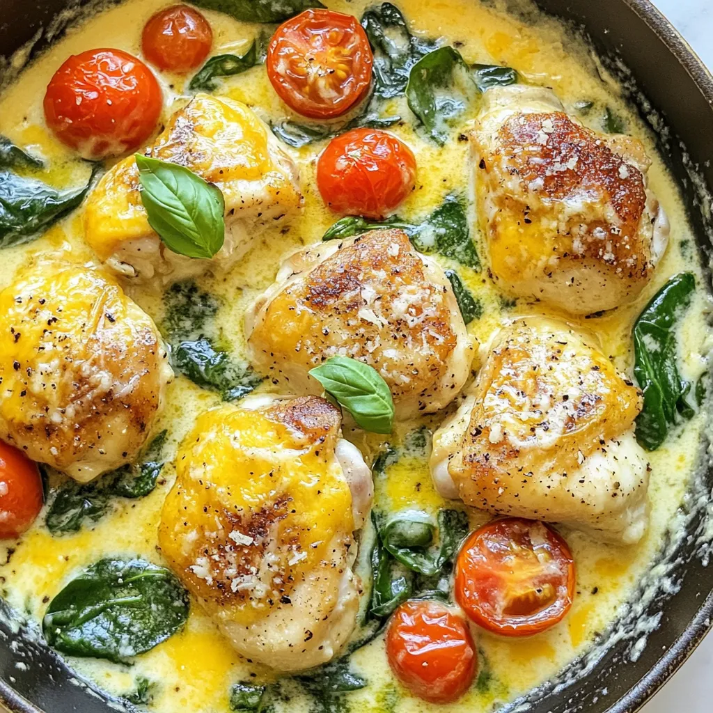 - 1 lb (450g) boneless, skinless chicken thighs, cut into bite-sized pieces - 2 cups fresh spinach, washed and trimmed - 1 cup cherry tomatoes, halved - 2 tablespoons olive oil - 3 cloves garlic, minced - 1 teaspoon dried oregano - 1 teaspoon smoked paprika - Salt and pepper to taste - ¼ cup heavy cream - ½ cup grated Parmesan cheese - Fresh basil leaves for garnish (optional) When choosing your chicken, look for thighs that are pink and firm. The skin should be smooth and free of blemishes. For spinach, choose bright green leaves with no yellow or brown spots. Cherry tomatoes should be plump and shiny. A good olive oil should smell fresh and fruity. Always check the expiration date on your cream and cheese to ensure freshness. If you want a leaner option, swap chicken thighs for chicken breasts. For a dairy-free version, replace heavy cream with coconut cream and use nutritional yeast instead of cheese. If you need a low-sodium meal, use salt-free seasoning blends and fresh herbs. You can also add more veggies like zucchini or bell peppers for extra nutrients. {{ingredient_image_1}} 1. Heat 2 tablespoons of olive oil in a large skillet over medium heat. 2. Add 1 pound of bite-sized chicken thighs. Season with salt, pepper, 1 teaspoon of oregano, and 1 teaspoon of smoked paprika. 3. Sauté the chicken until it is golden brown and cooked through. This should take about 7-10 minutes. 4. Next, add 3 minced garlic cloves to the skillet. Sauté for another 1-2 minutes until you smell the garlic. 5. Then, stir in 1 cup of halved cherry tomatoes. Cook for 3-4 minutes until they start to soften. 6. Lower the heat and add ¼ cup of heavy cream. Stir well and let it simmer for 2-3 minutes until it thickens slightly. 7. Fold in 2 cups of fresh spinach and cook for 1-2 minutes until it wilts. 8. Remove the skillet from the heat and mix in ½ cup of grated Parmesan cheese until it melts into a creamy sauce. 9. Taste your dish and adjust the seasoning if needed. - Prep Time: 10 minutes - Cook Time: 20 minutes - Total Time: 30 minutes - Servings: 4 - Large skillet - Wooden spoon or spatula - Knife and cutting board - Measuring cups and spoons - Serving dish or plates This quick dinner recipe is simple and full of flavor. Enjoy making it tonight! Each serving of this Keto Chicken Spinach Tomato Skillet has about: - Calories: 400 - Protein: 30g - Fat: 30g - Carbohydrates: 8g - Fiber: 2g - Net Carbs: 6g - Chicken Thighs: High in protein, they help build muscle and keep you full. - Spinach: Packed with vitamins A and K, it supports eye health and bone strength. - Cherry Tomatoes: Rich in antioxidants, they may lower the risk of heart disease. - Olive Oil: A healthy fat, it helps reduce inflammation and improve heart health. - Heavy Cream: Adds creaminess and provides healthy fats for energy. This dish fits perfectly into a keto diet. It has low carbs and high fat. The net carbs are only 6g per serving. This allows you to enjoy a rich meal while staying within your carb limit. The protein keeps you full longer, reducing cravings. Plus, the tasty flavors make it a satisfying choice for any dinner. Pro Tips Use Thighs for Flavor: Chicken thighs are more flavorful and juicier than chicken breasts, making them perfect for this dish. Fresh Herbs Matter: Using fresh basil as a garnish not only enhances the flavor but also adds a beautiful touch to the presentation. Adjust Creaminess: For a richer sauce, you can increase the amount of heavy cream or add a splash of chicken broth for extra depth. Perfectly Seasoned: Always taste your dish before serving; adjust the seasoning with salt and pepper to ensure the best flavor. {{image_2}} When making Keto Chicken Spinach Tomato Skillet, avoid these common errors: - Overcrowding the skillet: This can steam the chicken instead of browning it. Cook in batches if needed. - Not seasoning enough: Season the chicken well to enhance the flavor. Don't skip the salt and pepper! - Adding spinach too early: Add spinach at the end to keep it bright and fresh. To cook chicken perfectly, follow these steps: 1. Choose the right cut: Boneless, skinless thighs work well. They stay juicy and tender. 2. Preheat the skillet: Heat the olive oil until it's hot before adding chicken. 3. Don’t rush it: Let the chicken cook without stirring for a few minutes. This helps achieve a nice brown color. 4. Use a meat thermometer: Cook to an internal temperature of 165°F (75°C). This ensures it’s safe to eat. For a great meal, try these serving ideas: - Serve it straight from the skillet for a rustic look. - Pair with cauliflower rice for extra fiber without the carbs. - Top with fresh basil for a pop of color and flavor. - Add a side salad for crunch and freshness. You can switch up the chicken in this dish. Try using shrimp or tofu for a new taste. Both options cook quickly and add a unique flavor to the skillet. You can also change the spices. Instead of smoked paprika, try curry powder or chili flakes for extra heat. For a twist, add sun-dried tomatoes or olives to deepen the flavor. For a vegetarian version, skip the chicken. Use mushrooms instead; they add a nice texture. You can replace the heavy cream with coconut milk. It gives a rich taste without dairy. Also, try nutritional yeast instead of Parmesan cheese for a cheesy flavor without dairy. Add some chopped bell peppers or zucchini for more veggies. They cook well and add color. You could also toss in some cooked quinoa or lentils for added fiber and protein. A handful of nuts, like walnuts or pine nuts, can add crunch and healthy fats. These add-ins make your meal more filling and nutritious. To store leftovers, let the dish cool first. Then place it in an airtight container. Store it in the fridge for up to three days. You can also freeze it for up to one month. Just make sure to reheat it well before serving. Yes, you can make this dish in advance. Cook it fully, then cool it down. Store it in the fridge for up to three days. Whe
