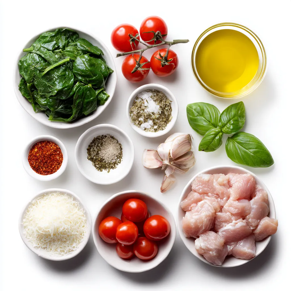 When choosing your chicken, look for thighs that are pink and firm. The skin should be smooth and free of blemishes. For spinach, choose bright green leaves with no yellow or brown spots. Cherry tomatoes should be plump and shiny. A good olive oil should smell fresh and fruity. Always check the expiration date on your cream and cheese to ensure freshness.