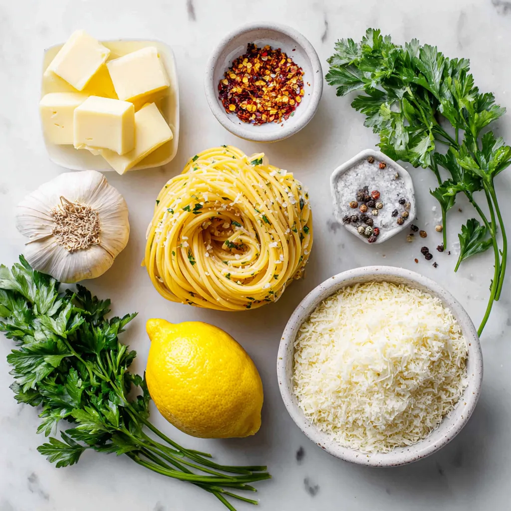 For this recipe, you need 8 ounces of pasta. This amount works well for 2 to 4 servings. Use a food scale or measuring cup for accuracy. You should have 4 tablespoons of butter, which adds richness. Make sure to mince 4 cloves of garlic for a strong flavor. The zest and juice from one lemon bring brightness and freshness. Red pepper flakes give a slight kick, but they are optional. You will also need 1/4 cup of grated Parmesan cheese for creaminess. Finally, use salt and black pepper to enhance the taste. Fresh parsley adds a nice touch to the dish.