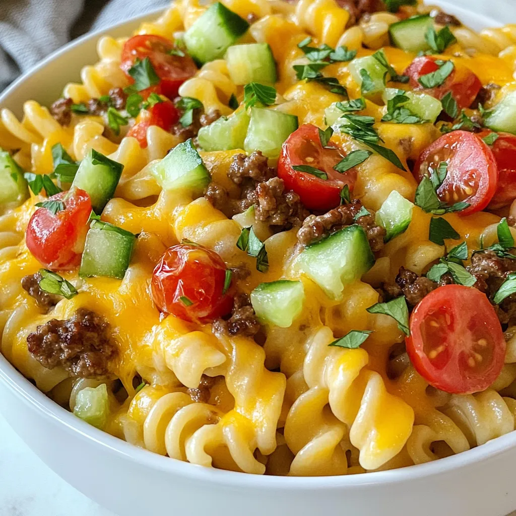 - Fettuccine pasta: This is the base of your dish. It holds the sauce well. Use 8 oz for four servings. - Ground beef: You need 1 lb of ground beef for a rich flavor. It adds protein and heartiness. - Dairy products: Heavy cream, cheddar cheese, Parmesan cheese, and cream cheese create a creamy sauce. They blend together to make a luxurious texture. - Vegetables: Use a small onion, two cloves of garlic, cherry tomatoes, half a cucumber, and green onions. They add color and crunch. - Seasonings: Italian seasoning, salt, and pepper enhance the taste. They bring out the best in every ingredient. These ingredients come together to create a delightful and comforting meal. Each one plays a key role in making Loaded Cheeseburger Alfredo a hit at your table. {{ingredient_image_1}} To cook fettuccine al dente, fill a large pot with water. Add a good amount of salt to the water. Bring it to a rolling boil. Add the fettuccine and cook according to the package directions. This usually takes about 8-10 minutes. Taste a piece to ensure it is firm but tender. When done, drain the pasta but save a cup of the pasta water. This water will help adjust the sauce later if needed. Reserving pasta water is very important. It contains starch that helps the sauce stick to the pasta. This makes your dish creamier and more flavorful. To brown the ground beef, heat a large skillet over medium heat. Add one tablespoon of olive oil to the skillet. Once hot, add the ground beef. Use a spoon to break it apart. Cook until it’s browned, which takes about 5-7 minutes. Make sure to stir it often for even cooking. Next, add diced onion and minced garlic to the skillet. Sauté these with the beef for another 3-4 minutes. The onion should turn translucent. This step adds great flavor to your dish. Now, it’s time to make the Alfredo sauce. Lower the heat to low. Add one cup of heavy cream to the skillet. Next, add softened cream cheese, shredded cheddar, and grated Parmesan cheese. Stir until everything melts and combines into a smooth sauce. Adjust the seasoning to your taste. Add one teaspoon of Italian seasoning, salt, and pepper. If the sauce feels too thick, you can add a bit of the reserved pasta water. This step ensures you get the creamy texture you want. To make sure the sauce coats the pasta well, follow these steps: - Use enough pasta water. When you drain the fettuccine, save some water. This water helps thin the sauce and make it stick to the pasta. - Combine quickly. Add the cooked pasta to the sauce while it’s hot. This keeps the sauce creamy and helps it cling to every noodle. To achieve the best flavor balance, consider these tips: - Taste as you go. Always taste your sauce before serving. Adjust the salt and pepper to fit your taste. - Add fresh ingredients at the end. Mixing in the cherry tomatoes, cucumber, and green onions at the end adds a fresh crunch and bright flavor. To make your Loaded Cheeseburger Alfredo look and taste amazing, try these garnishes: - Extra cheese. Sprinkle some more shredded cheddar on top just before serving. - Fresh parsley. A sprinkle of fresh parsley adds color and freshness. For side dishes that pair well, I suggest: - Garlic bread. It’s perfect for soaking up any leftover sauce. - A simple salad. A light green salad with a tangy dressing balances the rich pasta. These tips will help you serve a dish that impresses both in taste and looks! Pro Tips Use Quality Ingredients: High-quality cheeses and fresh vegetables enhance the flavor of your Alfredo sauce, making it richer and more delicious. Don’t Overcook the Pasta: Cook the fettuccine until al dente for the best texture. It will continue to cook slightly when mixed with the hot sauce. Adjust the Sauce Consistency: If your Alfredo sauce is too thick, gradually add reserved pasta water until you achieve your desired creaminess. Garnish for Freshness: Fresh herbs like parsley not only add color but also provide a burst of flavor that complements the dish beautifully. {{image_2}} You can change the meat in Loaded Cheeseburger Alfredo. Ground turkey gives a lighter option. Chicken also works well. Just cook it until golden brown, like the beef. For plant-based eaters, try lentils or veggie crumbles. They add great flavor and texture. To bring more heat, add a pinch of cayenne pepper or red pepper flakes. If you like sauces, drizzle hot sauce on top before serving. You can also spice things up with smoked paprika. For veggies, consider adding bell peppers or spinach. They add color and nutrition. You could even toss in some mushrooms. They bring a nice umami taste. Don't be shy; mix and match flavors! To keep your Loaded Cheeseburger Alfredo fresh, store it in an airtight container. This helps prevent moisture loss and keeps flavors intact. Let the pasta cool down before sealing it up. I recommend eating leftovers within three days for the best taste. After that, it might lose its creamy texture. When reheating, avoid the microwave if you can. Instead, use a skillet on low heat. This warms the pasta evenly and helps keep it moist. Stir in a splash of heavy cream or milk to revive the sauce's creaminess. If the sauce thickens too much, add a bit of reserved pasta water. This will bring it back to life! You can use milk and butter. Mix ¾ cup of milk with ¼ cup of melted butter. This gives a rich taste. For a lighter version, try half-and-half or coconut milk. Both options keep the dish creamy but lower the fat. Yes, you can prepare this dish in advance. Cook the pasta and store it separately. Keep the meat sauce in the fridge for up to three days. When ready to eat, warm the sauce and mix with the pasta. This saves time on busy nights. Absolutely! Kids love cheesy pasta. To please picky eaters, cut veggies smaller or skip them. You can also add more cheese for extra flavor. This dish is fun and tasty, making it a family favorite. This blog post covered everything you need to make Loaded Cheeseburger Alfredo. You learned 