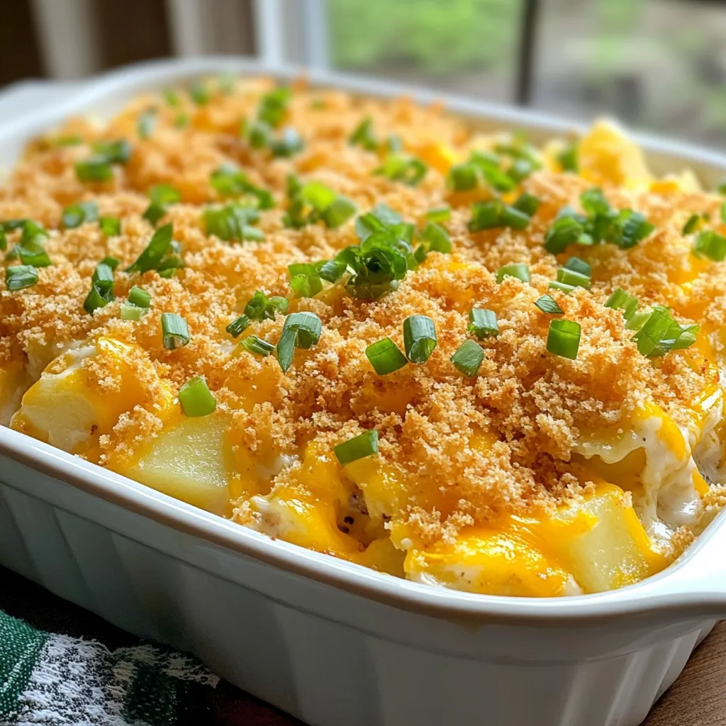 A hearty and delicious casserole featuring shredded chicken, cubed potatoes, ranch dressing, and topped with crispy breadcrumbs.