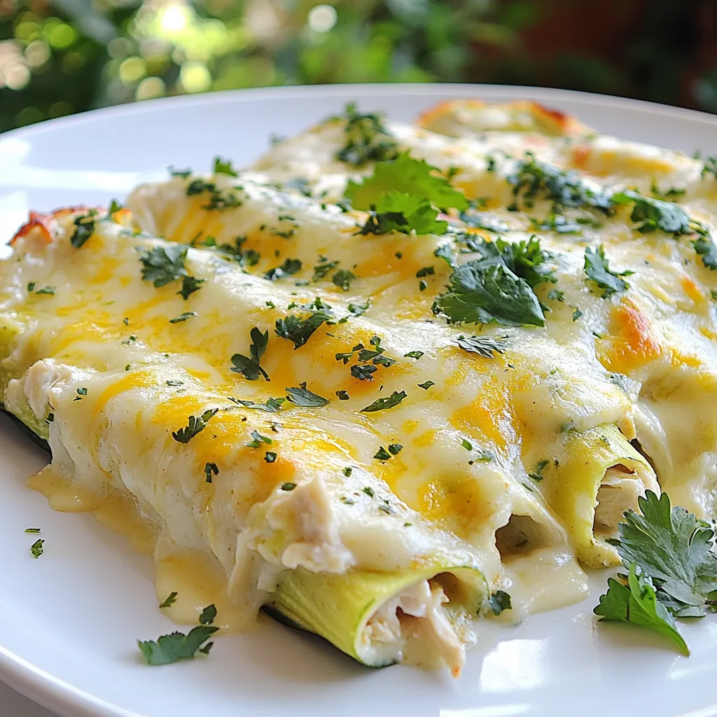 Delicious low carb enchiladas made with zucchini instead of tortillas, filled with a creamy chicken mixture.