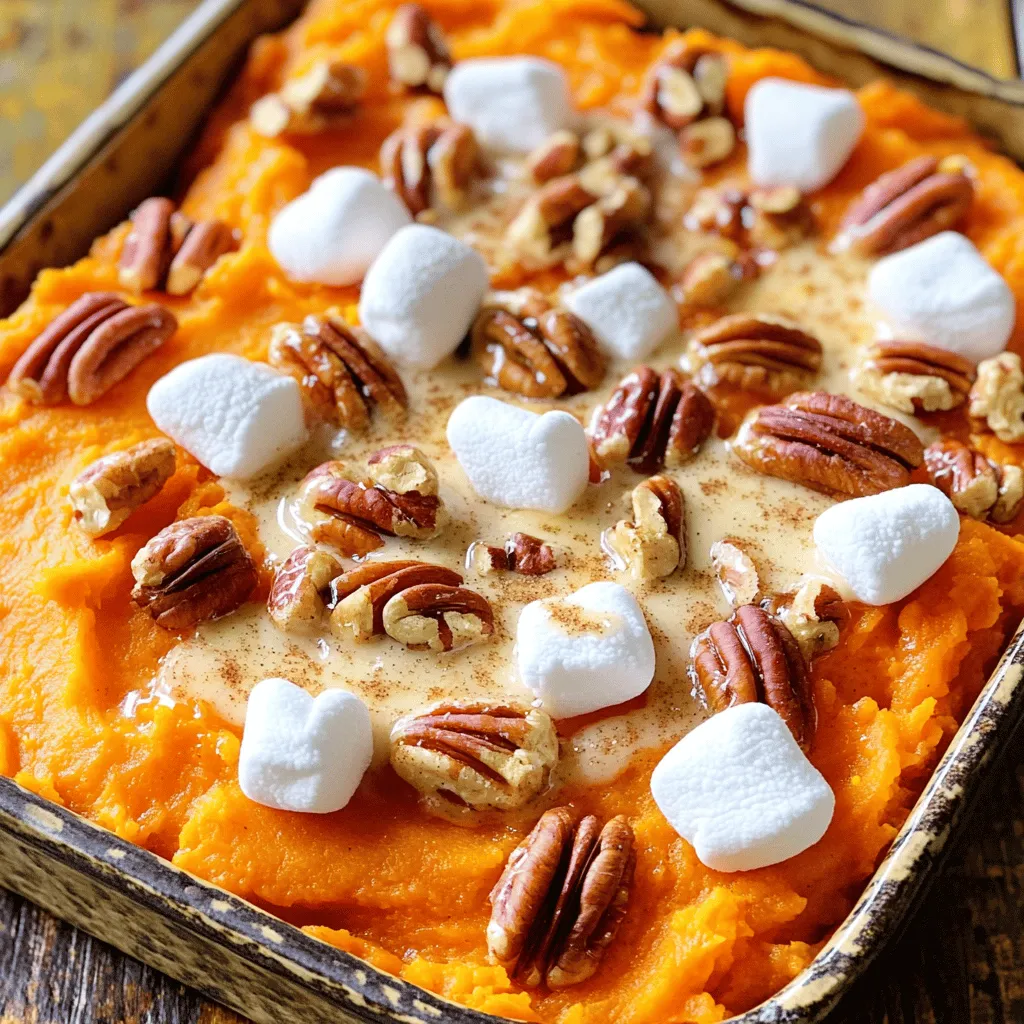 ![Making a Maple Pecan Sweet Potato Casserole is easy and fun. The flavors blend so well together. Here is what you need: - 4 large sweet potatoes, peeled and cubed - 1/2 cup maple syrup - 1/4 cup milk (or almond milk for a dairy-free option) - 1/4 cup unsalted butter, melted (or coconut oil for a dairy-free option) - 1 teaspoon vanilla extract - 1/2 teaspoon cinnamon - 1/4 teaspoon nutmeg - Salt to taste - 1 cup pecans, chopped - 1/2 cup miniature marshmallows (optional) Sweet potatoes are the star here. They bring sweetness and creaminess. Maple syrup adds a rich, natural taste. You can use milk or almond milk to make it creamy. The butter or coconut oil gives a nice richness. Vanilla makes everything taste better. Now, let's talk spices. Cinnamon and nutmeg add warmth and depth. They balance the sweetness and enhance the overall flavor. Chopped pecans add crunch and nutty goodness. If you like marshmallows, you can add them on top. They get all gooey and sweet when baked. You can find the full recipe for this delightful dish to guide you step by step. Cooking should be fun, and this casserole is a sure way to impress your family and friends! Boiling Sweet Potatoes Start by peeling and cubing four large sweet potatoes. Place them in a large pot. Cover the sweet potatoes with salted water. Bring the water to a boil over medium heat. Cook them for about 15 to 20 minutes. You want the sweet potatoes to be tender. Test them by poking with a fork. Once tender, drain the potatoes and let them cool slightly. Mashing Until Smooth In a mixing bowl, add the drained sweet potatoes. Mash them well until they are smooth. This step is key for a creamy texture. You can use a potato masher or a fork. It helps to get rid of any lumps. The smoother the mash, the better your casserole will be. Mixing Sweet Potato Mixture Now, add your flavor boosters. Pour in half a cup of maple syrup and a quarter cup of milk. If you want a dairy-free option, use almond milk. Then, add melted butter or coconut oil, one teaspoon of vanilla extract, half a teaspoon of cinnamon, and a quarter teaspoon of nutmeg. Add salt to taste. Mix everything well until it is creamy and fully combined. Transferring to Baking Dish Take a greased 9x13-inch baking dish. Carefully transfer the sweet potato mixture into the dish. Use a spatula to smooth the top. This helps ensure even baking. Mixing Pecans and Marshmallows In a separate bowl, chop one cup of pecans. If you like, you can add half a cup of miniature marshmallows. This is optional, but it adds sweetness. Mix the pecans and marshmallows together. Sprinkling Mixture over Sweet Potatoes Evenly sprinkle the pecan mixture over the sweet potato layer. This topping creates a great crunch. It also adds a lovely flavor contrast to the sweet potatoes. Setting the Oven Preheat your oven to 375°F (190°C). Make sure it is fully heated before baking. Baking Time and Temperature Now, place your casserole in the oven. Bake for 25 to 30 minutes. You want the casserole to be hot and the topping lightly toasted. When it’s done, remove it from the oven and let it cool for a few minutes before serving. This dish is a flavor explosion that everyone will love! For the full recipe, check out the detailed instructions provided earlier. Mashing Techniques To get the best texture, mash your sweet potatoes well. Use a potato masher or a ricer. These tools help achieve a creamy consistency. Avoid using a blender, as it can make the potatoes gluey. Avoiding Stringy Sweet Potatoes Choose fresh sweet potatoes. Older potatoes can be stringy. Boil them until they are very soft. This step helps you avoid any unpleasant strings in your casserole. Accurate Measurements for Success Measuring ingredients correctly is key for a great casserole. Use dry measuring cups for solids and liquid measuring cups for liquids. Level off flour or sugar with a knife for accuracy. This ensures your flavors come together perfectly. Additional Spices and Herbs You can boost flavor with more spices. Besides cinnamon and nutmeg, try a pinch of ginger or allspice. These spices add warmth and depth to your dish. Using Fresh Ingredients Always use fresh ingredients when possible. Fresh sweet potatoes taste better than canned. Fresh spices have more flavor than old ones. This tip will make your casserole a hit. For the full recipe, check the earlier sections. {{image_2}} You can easily make this casserole dairy-free. For milk, use almond milk or coconut milk. Both will keep it creamy and delicious. Instead of butter, try coconut oil. It adds a nice flavor and keeps the dish rich. If you need a gluten-free dish, check your ingredients. Ensure the maple syrup and any toppings are gluten-free. Most nuts are naturally gluten-free, so using pecans is a great choice. You can switch up the topping to suit your taste. Instead of pecans, try walnuts or hazelnuts for a new flavor. You can also add extra crunch with sunflower seeds. For a twist, consider sweet toppings. Mini marshmallows give a fun touch. If you prefer savory, add crispy bacon bits or herbs like rosemary. Each option adds a unique flavor and texture to your Maple Pecan Sweet Potato Casserole. For the full recipe, check out the details above. To keep your Maple Pecan Sweet Potato Casserole fresh, refrigerate it. First, let the casserole cool to room temperature. Then, cover it tightly with plastic wrap or aluminum foil. You can also transfer it to an airtight container. Proper refrigeration can keep it fresh for about three to five days. When reheating, you want to maintain that great flavor. The best way is to use an oven. Preheat your oven to 350°F (175°C). Place the casserole in a baking dish and cover it with foil. Heat it for about 20-25 minutes. This method keeps it moist and tasty. You can also use a microwave, but the oven is best for flavor. Want to save some for later? You can freeze the casserole! First, let it cool completely. Then, cut it into portions. Wrap each p