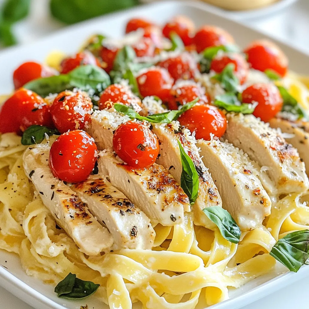 A delicious and creamy pasta dish with chicken and cherry tomatoes, perfect for a romantic dinner.