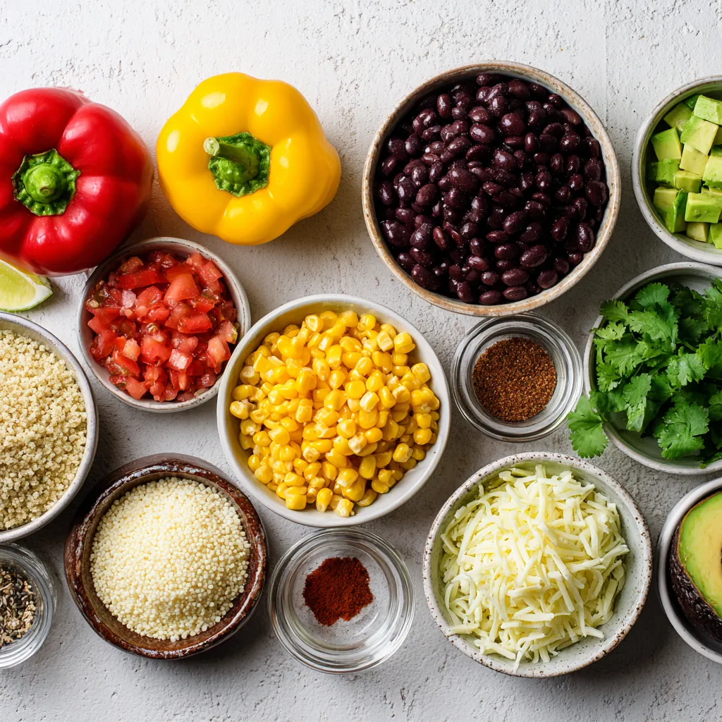These ingredients bring together a mix of flavors and textures. The bell peppers form a colorful base. Quinoa adds protein and a nutty taste. Black beans and corn add heartiness and sweetness. The spices give depth and warmth.