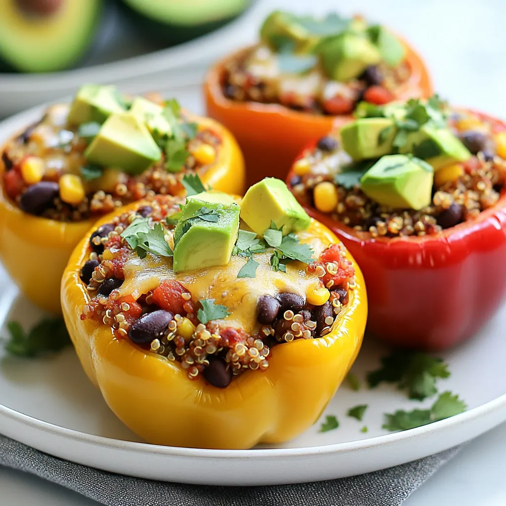 To create tasty Mexican stuffed peppers, you need the following fresh and healthy ingredients: - 4 large bell peppers (red, yellow, or green) - 1 cup quinoa, rinsed - 2 cups vegetable broth - 1 cup black beans, drained and rinsed - 1 cup corn kernels (fresh or frozen) - 1 cup diced tomatoes (canned or fresh) - 1 teaspoon ground cumin - 1 teaspoon chili powder - 1 teaspoon garlic powder - ½ teaspoon onion powder - Salt and pepper to taste - 1 cup shredded cheese (cheddar or Mexican blend) - Fresh cilantro, chopped (for garnish) - 1 avocado, diced (for topping) These ingredients bring together a mix of flavors and textures. The bell peppers form a colorful base. Quinoa adds protein and a nutty taste. Black beans and corn add heartiness and sweetness. The spices give depth and warmth. I love using fresh cilantro and avocado as toppings. They add a refreshing touch that makes each bite special. Enjoy gathering these ingredients! {{ingredient_image_1}} - First, preheat your oven to 375°F (190°C). - Next, cut the tops off the bell peppers. Remove all seeds and membranes. Set them aside. - Now, in a medium saucepan, combine the quinoa and vegetable broth. Bring this to a boil over medium heat. - Once it boils, reduce the heat to low. Cover it and simmer for about 15 minutes. The quinoa should be fluffy when done. - In a large mixing bowl, mix the cooked quinoa, black beans, corn, diced tomatoes, and your spices. Stir until everything blends well. - Carefully spoon this mixture into each bell pepper. Pack them tightly for a good fit. - Place the stuffed peppers upright in a baking dish. If they wobble, slice a bit off the bottom. This helps them stand. - Cover the baking dish with foil. Bake for 25 minutes, allowing the flavors to meld. - After 25 minutes, remove the foil. Sprinkle shredded cheese on top of each pepper. Return them to the oven. Bake for an additional 10 minutes. This melts the cheese perfectly. - Once done, take them out and let cool for a few minutes. - Garnish each stuffed pepper with diced avocado and chopped cilantro. This adds freshness. - For side dishes, consider serving with a simple green salad or tortilla chips. These pair nicely with the peppers. To keep your peppers stable while baking, slice a thin layer off the bottom. This helps them stand upright and look great on the plate. Always rinse the quinoa before cooking. This removes the bitter coating called saponin. When cooking quinoa, use two cups of vegetable broth for every cup of quinoa. Bring it to a boil, then lower the heat and cover. Let it simmer for about 15 minutes until fluffy. If you want a different taste, try using smoked paprika instead of chili powder. It adds a deep flavor without extra heat. To make the dish spicier, add a pinch of cayenne pepper or a chopped jalapeño to the filling. Always taste your mixture before stuffing the peppers. Adjust the spices based on your preference. For a fun twist, serve your peppers on a colorful platter. Use red, yellow, and green peppers for a vibrant look. You can also add a side of sour cream or yogurt for dipping. Top the peppers with diced avocado and fresh cilantro. This adds color and freshness, making each bite more delightful! Pro Tips Choose Colorful Peppers: Using a mix of red, yellow, and green bell peppers not only makes the dish visually appealing but also adds a variety of flavors. Perfectly Cooked Quinoa: Make sure to rinse the quinoa before cooking to remove any bitterness and ensure it cooks up fluffy. Customize Your Filling: Feel free to add your favorite vegetables or proteins to the quinoa mixture for an extra twist. Ground turkey or chopped zucchini work great! Serve with a Side: Pair your stuffed peppers with a fresh side salad or some tortilla chips and salsa for a complete meal. {{image_2}} You can switch up the protein in stuffed peppers. Ground chicken, beef, or turkey works well. They add a hearty bite. If you prefer to keep it meatless, try black beans, lentils, or tofu. These options are filling and tasty. They fit right into the mix. Quinoa is great, but you can swap it out. Rice or couscous can take its place. They will change the texture but keep it yummy. You might also explore lentils or other legumes. These can add protein and unique flavors. Feel free to add different vegetables for extra flavor. Zucchini, spinach, or mushrooms can enhance your dish. Experiment with spices from around the world. Adding cumin or smoked paprika can elevate the taste. Don't be afraid to mix and match! To keep your stuffed peppers fresh, use an airtight container. This helps to seal in flavor. You can store them in the fridge for about 3 to 5 days. Make sure they cool down before sealing. This way, they won't turn soggy. If you want to freeze your stuffed peppers, wrap them well. Use plastic wrap first, then place them in a freezer bag. This method prevents freezer burn. They can last up to 3 months in the freezer. To reheat frozen peppers, let them thaw in the fridge overnight. You can also bake them straight from the freezer. Just add 10 to 15 minutes to the baking time. Check for warmth in the center before serving. Can I make stuffed peppers in advance? Yes, you can prepare stuffed peppers ahead of time. You can stuff the peppers and store them in the fridge. Just cover them with plastic wrap or foil. They stay good for about two days. When ready, bake them as directed. What can I substitute for quinoa? If you don't have quinoa, you can use rice or couscous. These grains work well in this recipe. You can also try lentils for a different flavor and texture. How can I make these stuffed peppers spicier? To add heat, you can use jalapeños or hot sauce. Red pepper flakes also give that nice kick. Adjust the spice level to match your taste. Each stuffed pepper contains about 300 calories. They are high in fiber and protein. This recipe is a great source of vitamins A and C. If you want fewer calories, use less cheese or skip it. If you can't fi