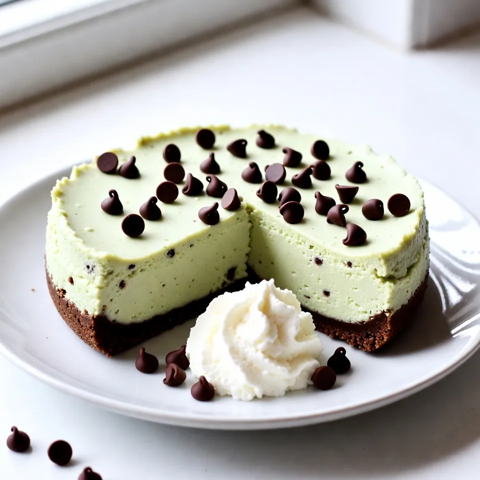 Slice the cheesecake into neat wedges. A sharp knife helps get clean cuts. Serve with whipped cream on the side. A sprig of fresh mint makes each plate pop with color. For a touch of elegance, drizzle chocolate sauce on the plate. A sprinkle of extra mini chocolate chips on top adds a delightful crunch.