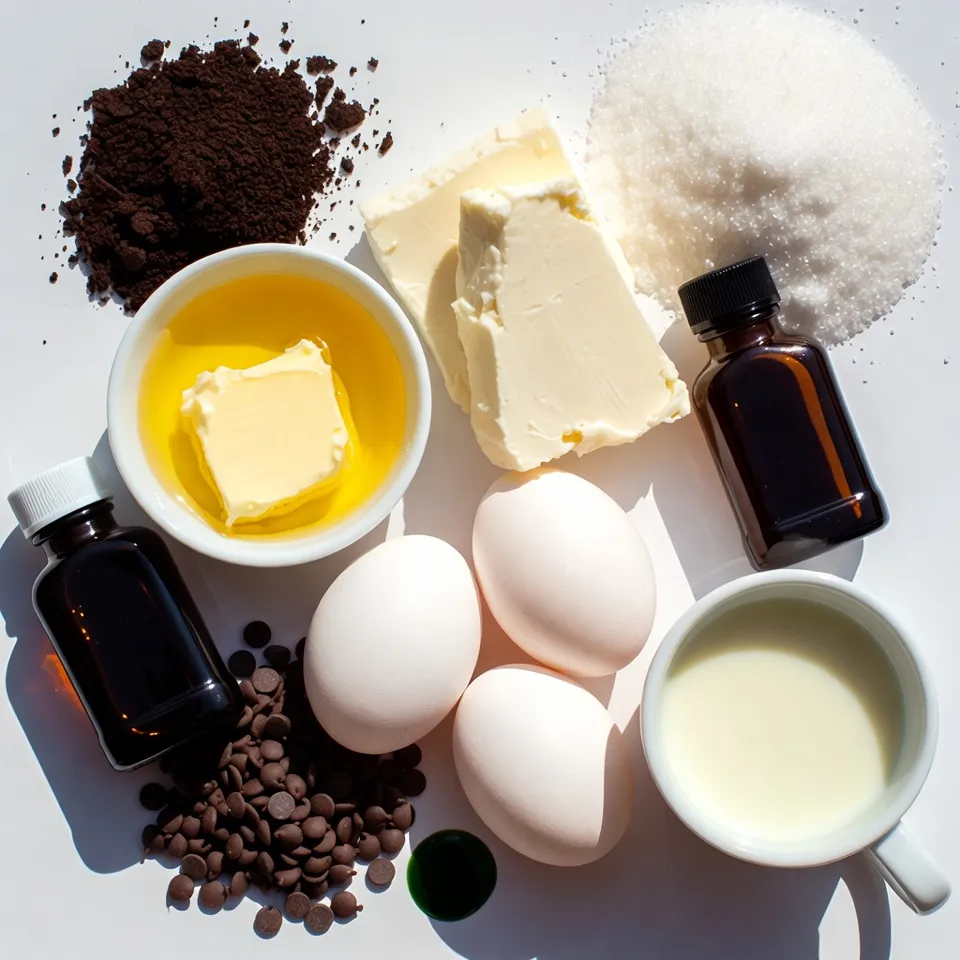 To make mint chocolate chip cheesecake, gather these fun ingredients. The chocolate cookie crumbs create a tasty crust. Melt the unsalted butter to mix with the crumbs. Cream cheese gives the filling its smooth texture. Granulated sugar adds the right sweetness. Vanilla and peppermint extracts bring wonderful flavors. Eggs help bind everything together. Heavy cream makes the filling rich and creamy. Mini chocolate chips add extra chocolate goodness. If you want a minty color, use green food coloring. Finally, save some mini chocolate chips to top the cheesecake for a sweet finish. Enjoy selecting these ingredients and get ready to bake!