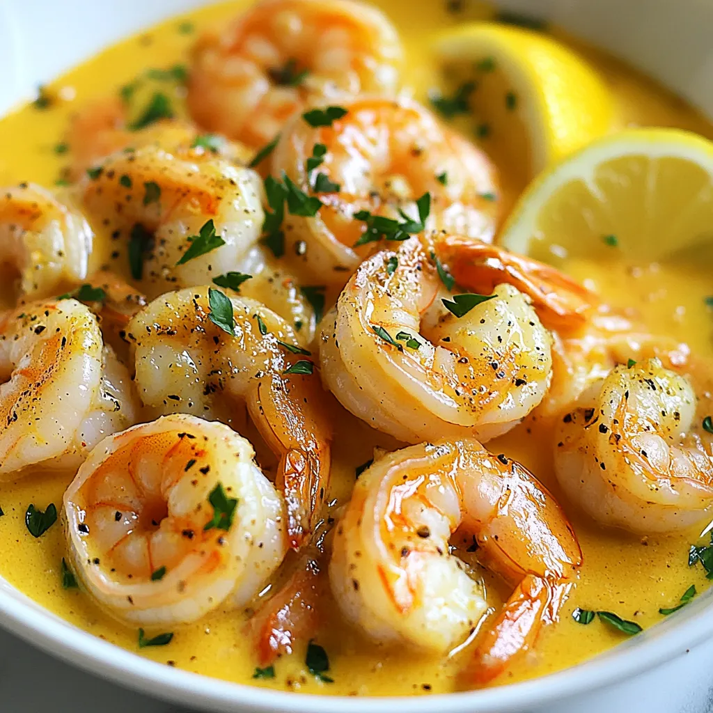 To make Minute Creamy Garlic Shrimp, you will need the following fresh and simple ingredients: - 1 pound large shrimp, peeled and deveined - 4 cloves garlic, minced - 1 cup heavy cream - 1 cup chicken or vegetable broth - 2 tablespoons olive oil - 1 teaspoon smoked paprika - Salt and pepper to taste - 2 tablespoons fresh parsley, chopped (for garnish) - Zest of 1 lemon - Optional: ½ cup grated Parmesan cheese Each ingredient plays a key role. The shrimp gives the dish its main protein. Garlic adds rich flavor, while heavy cream creates that luscious sauce. Broth adds depth, and smoked paprika gives a nice smokiness. I love using fresh parsley to brighten the dish. A little lemon zest lifts all the flavors. If you want extra creaminess, Parmesan is a great choice. Gather these ingredients, and you are ready to create a delicious meal in no time! {{ingredient_image_1}} First, rinse the shrimp under cold water. This step helps to remove any grit. Next, pat them dry with paper towels. This keeps the shrimp from steaming when you cook them. For flavor, season the shrimp lightly with salt, pepper, and smoked paprika. The smoked paprika adds a nice depth. Use a large skillet for this step. Heat the olive oil over medium heat. Once hot, add the minced garlic. Sauté for about 1 minute. Watch closely to avoid burning. When it becomes fragrant, it’s ready for the next step. Now, add the seasoned shrimp to the skillet. Cook for 2 minutes on each side. Look for a pink and opaque color. This shows they are done. After cooking, remove the shrimp and set them aside. In the same skillet, pour in the chicken or vegetable broth. Scrape any brown bits from the bottom. This adds flavor to the sauce. Bring it to a simmer and let it reduce for about 3-4 minutes. This thickens the broth nicely. Then, lower the heat and stir in the heavy cream. If you want extra creaminess, add grated Parmesan cheese. Stir until it melts. Return the cooked shrimp to the skillet. Mix them into the creamy sauce. Heat everything through for about 1-2 minutes. Adjust the seasoning with more salt and pepper if needed. For a fresh twist, add lemon zest. This brightens the dish and enhances the flavor. Enjoy your creamy garlic shrimp! To cook shrimp just right, watch for a few signs. When shrimp turns pink and opaque, it's ready. This takes about 2 minutes per side. Overcooking makes shrimp tough and rubbery. If they curl tightly, they are likely overdone. Remove them from heat when they look perfect. To boost flavor, consider adding fresh herbs. Basil, dill, or thyme work well. You can also try a dash of cayenne for heat. For a zesty note, add lemon juice or zest. These small tweaks can make your dish stand out. Don't be afraid to experiment with spices you love. Pair your creamy garlic shrimp with a variety of sides. Serve it over pasta or rice for a filling meal. You can also add steamed veggies for color and nutrition. A fresh salad with lemon vinaigrette complements the dish well. For a hearty option, try crusty bread to soak up the sauce. Pro Tips Use Fresh Shrimp: Always opt for fresh shrimp whenever possible; it enhances the flavor and texture of the dish. Don’t Overcook: Be careful not to overcook the shrimp; they should be pink and opaque, which usually takes just 2 minutes per side. Adjust Creaminess: If you prefer a richer sauce, add more Parmesan cheese or even a splash of white wine for depth. Garnish for Flavor: Don’t skip the garnish! Fresh parsley and lemon zest add brightness and elevate the dish visually. {{image_2}} You can easily swap shrimp for chicken or tofu. Chicken thighs work well. Cut them into bite-sized pieces. Cook them the same way as shrimp, but add a few more minutes to ensure they cook through. Tofu is also tasty. Use firm or extra-firm tofu for the best texture. Just cube it and sauté until golden before adding to the sauce. If you want a spicy kick, try adding red pepper flakes. Start with a pinch and taste as you go. This small change can make a big difference! You can also mix in a splash of hot sauce for a different heat profile. This adds depth and excitement to the dish. For a dairy-free version, substitute heavy cream with coconut milk. It adds a nice creaminess without dairy. If you are gluten-free, ensure your broth is gluten-free. You can also use gluten-free pasta as a base to serve the dish. These swaps keep the dish delicious while fitting your needs. To store your creamy garlic shrimp, place it in an airtight container. Ensure the dish cools to room temperature before sealing it. This prevents steam buildup, which can make the shrimp soggy. Keep it in the fridge for up to three days. When you're ready to eat, just reheat it on low heat. Stir occasionally to keep the sauce creamy. If you want to save the dish for later, freezing is a great option. First, let the shrimp cool completely. Then, transfer it to a freezer-safe container. Make sure to leave space at the top, as liquids expand when frozen. You can freeze it for up to two months. To reheat, thaw it in the fridge overnight and warm it gently on the stove. This keeps the shrimp from becoming rubbery. In the fridge, creamy garlic shrimp lasts for about three days. If frozen, it stays good for two months. Always check for signs of spoilage before eating leftovers. If it smells off or looks strange, it's best to toss it. Storing your shrimp properly ensures it stays fresh and tasty for your next meal. It takes about 20 minutes to make this dish. You will spend 10 minutes prepping the ingredients. Cooking the shrimp and sauce takes about 10 minutes. This quick time means you can enjoy a tasty meal without much hassle. Yes, you can use frozen shrimp. Just make sure to thaw them first. Place the shrimp in a bowl of cold water for about 15-20 minutes. This method is quick and helps keep the shrimp tender. I suggest pairing the shrimp with rice or pasta. A fresh salad also works great. You can serve it with garlic bread to soak up
