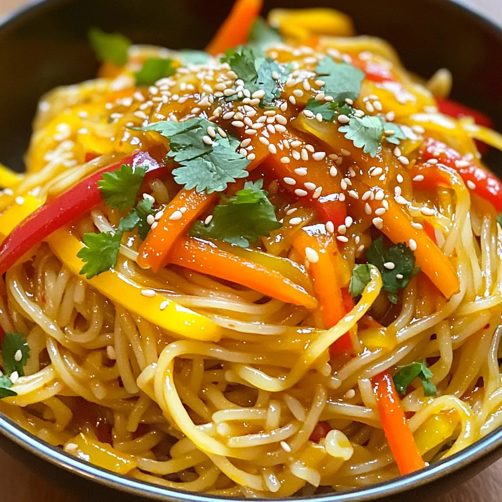 Now it’s time to bring everything together. Lower the heat a bit. Add the cooked rice noodles to the skillet with your sautéed veggies. Pour in two tablespoons of sweet chili sauce and one tablespoon of soy sauce. Stir everything gently to coat the noodles. Let it warm for about 2 to 3 minutes. Finally, sprinkle chopped green onions on top and give it one last toss. Serve the noodles in bowls. You can add sesame seeds and fresh cilantro for a nice touch!