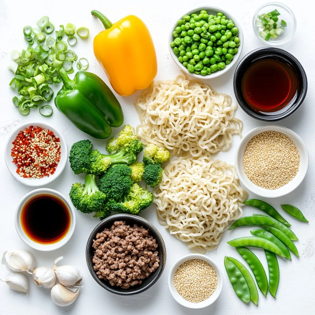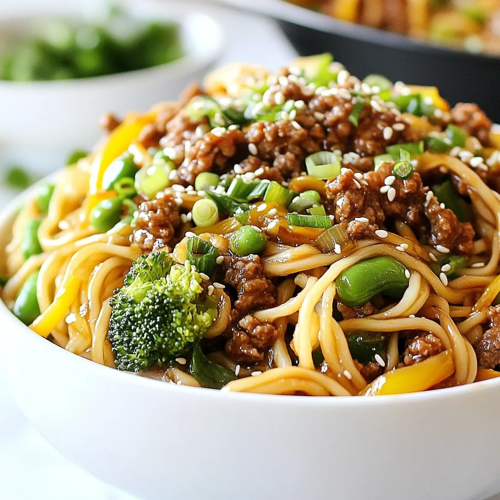 - 1 lb ground beef - 8 oz egg noodles - 2 tablespoons vegetable oil - 1 medium onion, finely chopped - 3 garlic cloves, minced - 1 inch ginger, grated - 2 green bell peppers, sliced - 1 cup broccoli florets - 1 cup snap peas These ingredients create a solid base for your dish. Ground beef gives it richness. Egg noodles provide a hearty texture. Fresh vegetables add color and crunch. - 3 tablespoons soy sauce - 1 tablespoon hoisin sauce - 1 tablespoon sesame oil - 1 tablespoon brown sugar - 1 teaspoon crushed red pepper flakes (optional) The sauce pulls it all together. Soy sauce adds umami. Hoisin sauce brings sweetness. Sesame oil provides a nutty flavor. Brown sugar balances the salty notes. If you like heat, add red pepper flakes! With these ingredients, you build a flavorful meal that is quick and easy to make. {{ingredient_image_1}} Start by cooking the egg noodles. Follow the package instructions carefully. This usually takes around 5-7 minutes. Once cooked, drain the noodles and set them aside. Make sure to toss them with a little oil to prevent sticking. In a large skillet or wok, heat the vegetable oil over medium-high heat. You want the oil to shimmer but not smoke. Next, add your chopped onion. Sauté for about 2-3 minutes until it turns translucent. This helps release its natural sweetness. After that, add minced garlic and grated ginger. Stir the mixture for about 1 minute. You’ll start to smell a wonderful aroma. Push the onion mixture to one side of the skillet. Now, add the ground beef to the empty side. Cook the beef until it is browned and fully cooked. This should take about 5-7 minutes. Use a spatula to break it apart as it cooks. Once the beef is ready, stir in sliced bell peppers, broccoli florets, and snap peas. Cook everything for an additional 4-5 minutes. The vegetables should be tender but still crisp. This adds great texture to your dish. In a small bowl, whisk together the soy sauce, hoisin sauce, sesame oil, brown sugar, and any red pepper flakes if you like some heat. Pour this sauce over the beef and vegetables. Stir well to coat everything evenly. Now, add the cooked egg noodles to the skillet. Toss everything together. Make sure the noodles are heated through and mixed well with the sauce. This should take about 2 minutes. Finally, remove the skillet from heat. Adjust the seasoning with extra soy sauce if needed. Enjoy your flavorful Mongolian Ground Beef Noodles! Adjusting Seasoning Taste your dish as you cook. If it seems bland, add more soy sauce. A touch more hoisin sauce can boost the sweet flavor. If you want more heat, sprinkle in some crushed red pepper flakes. Adjust until it feels just right for you. Balancing Sweet and Savory The key to great flavor is balance. You want both sweet and savory notes. If your dish is too sweet, add a splash more soy sauce. If it’s too savory, mix in a little brown sugar. This way, you create a rich, layered taste that delights your palate. Using a Wok vs. Skillet A wok is ideal for cooking at high heat. It allows for even cooking and great stir-frying. If you don’t have one, a large skillet works too. Just make sure it has high sides to contain the ingredients. Both methods will yield tasty results. Tips for High-Temperature Cooking Preheat your pan before adding oil. This helps to sear the beef quickly. Make sure not to overcrowd the pan. Cook in batches if needed. This keeps the beef juicy and tender while giving it a nice brown color. Enhancing Presentation Presentation matters! Serve the noodles in big bowls. This makes it look inviting. A sprinkle of sesame seeds adds a nice crunch. It also gives a lovely visual touch. Best Herbs and Toppings Chopped green onions make a great topping. They add freshness and color. You can also try cilantro for a different flavor. A squeeze of lime can brighten the dish even more. Use what you love! Pro Tips Use Fresh Ingredients: Fresh vegetables add vibrant flavor and nutrition to the dish. Whenever possible, choose seasonal produce for the best taste. Adjust Spice Levels: If you enjoy more heat, feel free to increase the amount of crushed red pepper flakes or add sliced fresh chili peppers to the mix. Meal Prep Friendly: This dish can be made ahead of time and stored in the refrigerator for up to 3 days. Simply reheat on the stove or in the microwave when ready to serve. Pair with Sides: Serve your Mongolian Ground Beef Noodles with a side of steamed rice or a fresh salad to round out the meal. {{image_2}} You can swap ground beef for other meats. Ground turkey or chicken works great. They are leaner but still tasty. You can use the same method as with beef. For a vegetarian option, try using lentils or mushrooms. Lentils add protein and fiber. Mushrooms give a nice texture and earthy flavor. Both choices keep the dish hearty. While egg noodles are traditional, you can switch to rice noodles. They soak up flavors well and are gluten-free. Simply cook them as per package directions. Zucchini noodles are another fun choice. They are low-carb and add freshness. Just spiralize the zucchini and toss them in at the end. This keeps them crisp. Feel free to add seasonal veggies. Carrots, bell peppers, and spinach all work well. They boost nutrition and color in the dish. If you like heat, add crushed red pepper flakes or sliced jalapeños. This adds spice without overwhelming the flavors. You can adjust based on your taste. To keep your Mongolian ground beef noodles fresh, cool them before storing. Let the dish sit at room temperature for about 30 minutes. Once cool, place it in an airtight container. Store in the fridge for up to three days. Be sure to label the container with the date. This way, you know when to eat it! You can freeze the noodles for later. First, let the dish cool completely. Then, divide it into portions for easy thawing. Use freezer-safe containers or bags. Remove as much air as you can to avoid freezer burn. Your noodles can stay good in the freezer fo