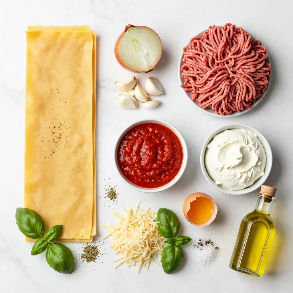 - 12 lasagna noodles - 1 lb ground beef or turkey - 1 onion, chopped For my lasagna, I always use 12 lasagna noodles. They create a firm base. I prefer ground beef, but turkey works well too. It gives a lighter touch. I chop one onion to add flavor to the meat sauce. - 15 oz ricotta cheese - 2 cups shredded mozzarella cheese - 1 cup grated Parmesan cheese I love to use 15 ounces of ricotta cheese. It makes the layers creamy. I add 2 cups of shredded mozzarella for that gooey texture. A sprinkle of 1 cup of grated Parmesan adds a nice salty kick. - 1 tablespoon dried oregano - 1 tablespoon fresh basil (or 1 teaspoon dried) - Olive oil for cooking, salt, and pepper Seasonings are key for great flavor. I use 1 tablespoon of dried oregano and fresh basil. If I don’t have fresh basil, dried works too. I cook with a splash of olive oil, and I always season with salt and pepper. These simple ingredients make a big difference in taste. {{ingredient_image_1}} First, I boil a large pot of salted water. I cook the lasagna noodles according to the package instructions. This usually takes about 8 to 10 minutes. You want them al dente, not too soft. Once cooked, I drain them and lay the noodles flat on a baking sheet. This keeps them from sticking together. In a large skillet, I heat a tablespoon of olive oil over medium heat. Then, I add the chopped onion and minced garlic. I sauté them for about 3 to 4 minutes until they soften. Next, I add the ground beef or turkey to the skillet. I cook it until browned, breaking it apart with a spatula. After it’s cooked, I drain any excess fat. I then stir in the marinara sauce along with oregano, basil, salt, and pepper. I let it simmer for 5 to 10 minutes. This helps meld the flavors together. In a separate bowl, I mix the ricotta cheese with one egg. I add a pinch of salt and pepper. I stir it until smooth. This mixture adds creaminess to the lasagna. To assemble, I spread a thin layer of meat sauce at the bottom of my baking dish. I place 4 lasagna noodles over the sauce. Then, I spread half of the ricotta mixture over the noodles. Next, I layer more meat sauce and sprinkle mozzarella cheese on top. I repeat these layers. For the final layer, I top with the last 4 noodles, the remaining meat sauce, and mozzarella cheese. I finish with grated Parmesan cheese on top. I cover it with foil and bake it in the preheated oven for 25 minutes. After that, I remove the foil and bake for an additional 15 to 20 minutes until the cheese is bubbly and golden. Finally, I let the lasagna cool for 10 to 15 minutes before slicing. This helps it keep its shape. Layering your lasagna right makes all the difference. Start with a thin layer of meat sauce on the bottom. This prevents sticking. Next, lay down four noodles side by side. Make sure they don’t overlap. Add half of the ricotta mixture on top. Then, spread more meat sauce and sprinkle mozzarella cheese. Repeat this twice. To avoid sogginess, don’t over-sauce. Use just enough liquid to flavor the noodles. Drain cooked noodles well before layering. This keeps them firm. The best temperature for baking lasagna is 375°F (190°C). This lets the cheese melt perfectly. Cover the dish with foil for the first 25 minutes. This helps the cheese melt without burning. After that, remove the foil. Bake uncovered for an extra 15-20 minutes. You want the cheese golden and bubbly. For a great presentation, cut the lasagna into squares. Serve it hot on a bright plate. A sprinkle of fresh basil adds color and flavor. Pair your lasagna with garlic bread for a hearty meal. You can also add a side salad for a fresh touch. These extras make your dish feel special and inviting. Pro Tips Tip for Layering: Make sure to spread the ricotta mixture evenly for a balanced flavor in every bite. Tip for Meat Options: Feel free to substitute the ground beef with Italian sausage for an extra kick of flavor! Tip for Cheese: For a cheesier lasagna, mix different types of cheese like provolone or gouda with the mozzarella. Tip for Resting: Let the lasagna rest after baking; this helps it hold its shape when you slice it. {{image_2}} You can easily make a vegetarian lasagna. Just swap the meat for your favorite veggies. Try using spinach, mushrooms, or zucchini. These add great flavor and color. You can also mix in bell peppers or artichokes. For cheese, look for vegetarian options. Many brands offer plant-based mozzarella and ricotta. This keeps the dish creamy without meat. If you need a gluten-free lasagna, use gluten-free noodles. They come in many types, so pick your favorite. Some options are made from rice, corn, or quinoa. Make sure your sauce and cheese are gluten-free too. Most marinara sauces are safe, but check the label. Some cheeses may have added ingredients, so read closely. To make your lasagna unique, add spices and herbs. Try red pepper flakes for heat or fresh parsley for freshness. You can also add a pinch of nutmeg to your ricotta for warmth. Mix different cheese types for a fun twist. Use gouda or fontina for a richer flavor. A blend of cheeses creates a tasty surprise in every bite. To keep your leftover lasagna fresh, you can refrigerate or freeze it. If you plan to eat it soon, refrigerating works best. Use an airtight container or wrap it tightly with plastic wrap. For longer storage, freeze the lasagna. A heavy-duty freezer bag or a freezer-safe container works well. Make sure to remove as much air as possible to prevent freezer burn. When it's time to enjoy your lasagna again, proper reheating is key. The best way is to use the oven. Preheat it to 350°F (175°C). Place the lasagna in an oven-safe dish. Cover it with foil to keep it moist. Heat for about 20-25 minutes. You can also microwave it if you're in a hurry. Use a microwave-safe plate and heat in short bursts. Stir or check often to avoid cold spots. In the fridge, your lasagna lasts about 3-5 days. If you freeze it, it can last up to 3 months. Always check for s