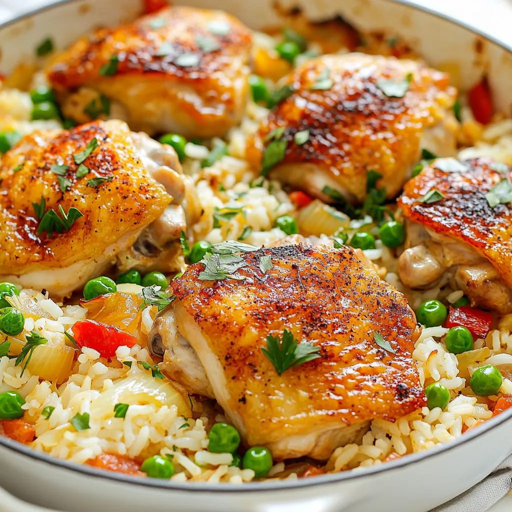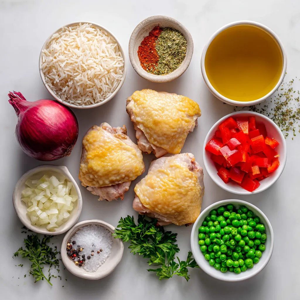 Gather these ingredients before you start cooking. The chicken thighs are key for flavor and moisture. The rice soaks up all the tasty broth. Using fresh vegetables adds color and crunch. The spices bring warmth and depth to the dish. Olive oil helps with cooking the chicken and veggies. Lastly, fresh parsley adds a pop of color when serving.