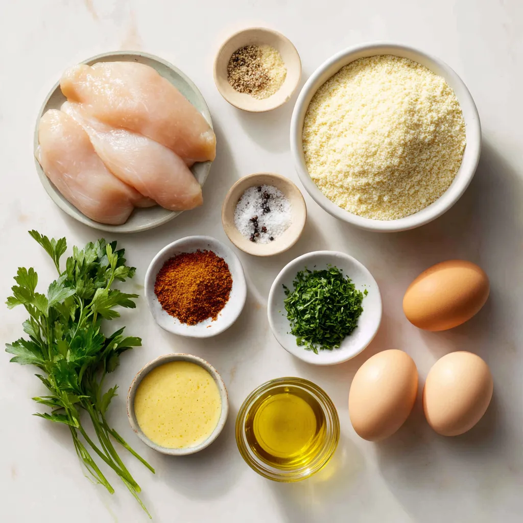 Start by preheating your oven to 400°F (200°C). This helps the chicken cook evenly. Next, line a baking sheet with parchment paper. This keeps the chicken from sticking. Then, grab a shallow bowl. Combine 1 cup of grated Parmesan cheese with 1/2 cup of almond flour. Add 1 teaspoon of garlic powder, 1 teaspoon of onion powder, 1 teaspoon of smoked paprika, 1/2 teaspoon of black pepper, and 1/2 teaspoon of salt. Mix well to create a tasty crust.