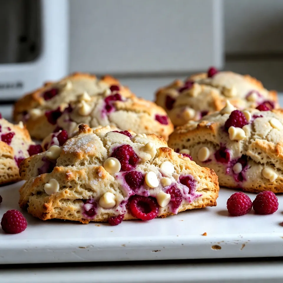 Delicious scones filled with fresh raspberries and white chocolate, perfect for breakfast or a snack.